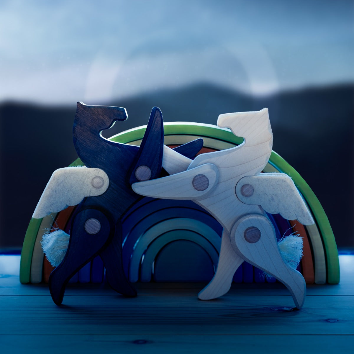 Bajo Tobe Pegasus toys stood on their back legs leaning against each other in front of an arch rainbow at night. Tobe is part of the Bajo family. These heirloom quality toys by Bajo are part of a wide range of wooden toys available here at Babipur.
