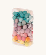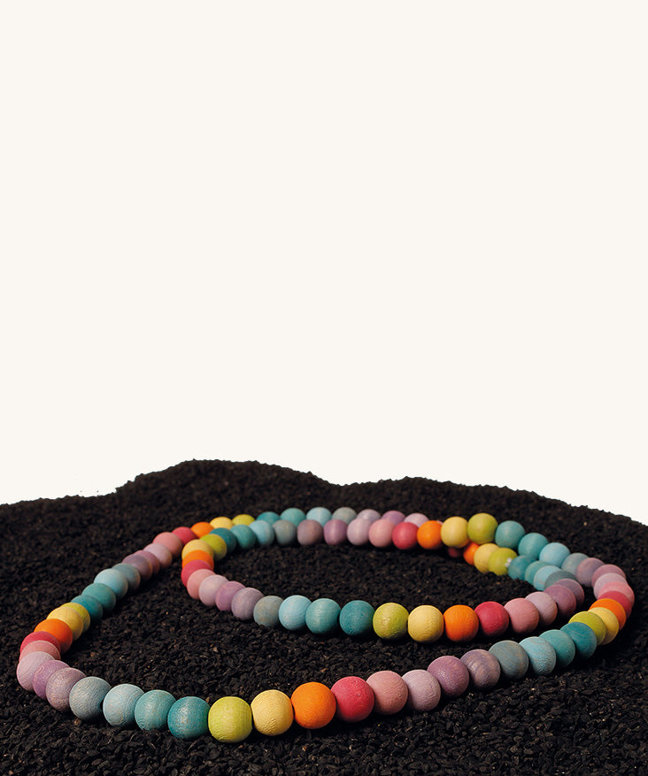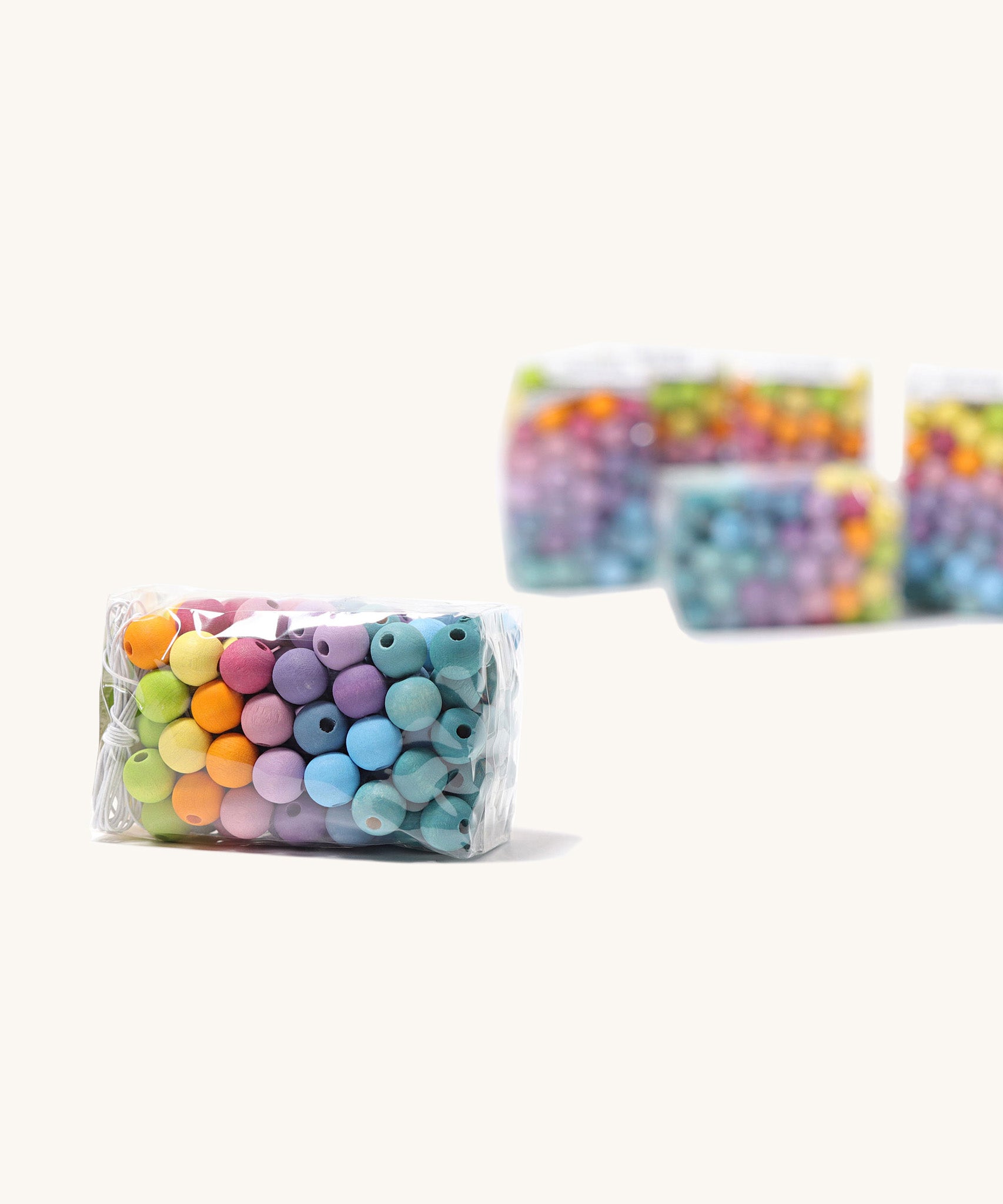A pack of 120 wooden beads in a pretty pastel rainbow array of colours. Each bead has a hole through the middle making them great for threading string through, and handy for counting games and learning colours, maths aids and for playing with as wooden marbles.