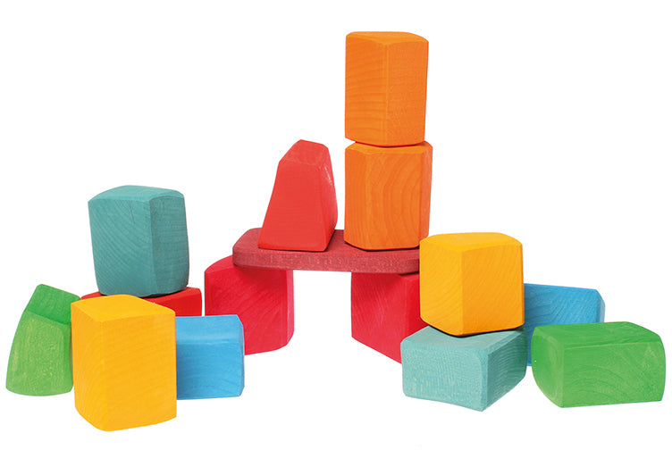 We love these wibbly, wobbly wooden blocks. Who says building blocks need to have straight sides? This set has been hand-sanded to remove all sharp edges and corners and they have been left unvarnished to enable even babies to build successfully. These irregular wooden building blocks are as unique and beautiful as the children who play with them. You can build and make patterns with this unusual building block set, and combine with other wooden blocks from Grimm's Toys for even more creative possibilities. Building with these hand-crafted blocks and getting them to balance will hone children's patience, co-ordination and problem-solving abilities. Like all block sets, they can also become maths counters, play food or items to sort by colour. This wooden toy will appeal to Montessori and Steiner educators, parents and children alike.