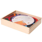 The building pieces are made with birch or poplar plywood and coloured with non-toxic, water-based colour stain. They come in a wooden storage box with a clear plexiglass lid for easy storage.