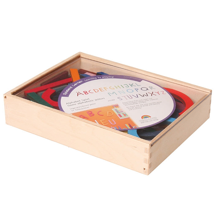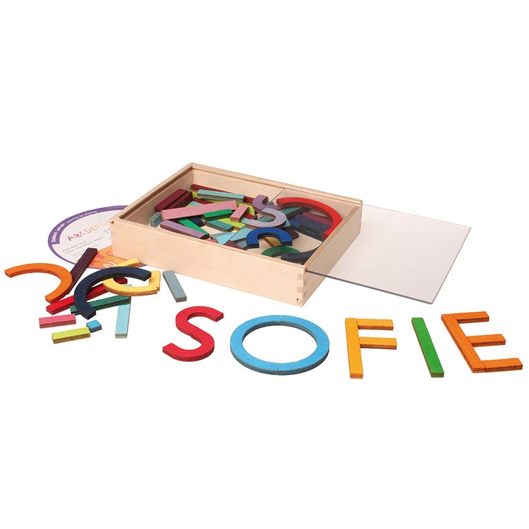 This Grimm's Letter Shapes wooden play set is a great educational toy for teaching children the alphabet, how to spell out simple words and can also be used to create numbers, pictures and build with too. This alphabet toy has 77 pieces in six shapes and 26 colours - encourage children to pick out shapes in the same colour to make each letter of the alphabet or mix it up for multicoloured rainbow letters. This wooden learning toy will be a hit with parents, teachers and home educators alike. Montessori fans will also love that this wooden alphabet toy can be used in multiple ways for imaginative play and learning.