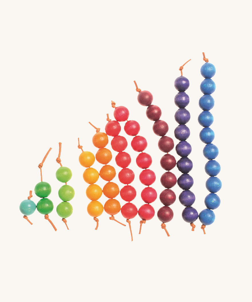 Steiner educators will love this multi-purpose educational toy as it can be used for natural play in a myriad of ways - use the beads with a longer string to make a necklace; create patterns when doing threading games, learn to count and do simple sums, learn colours or use the beads as ingredients in a play kitchen. Combine with other maths and counting toys from Grimm's for further fun learning opportunities.