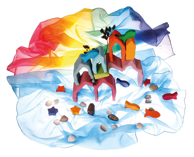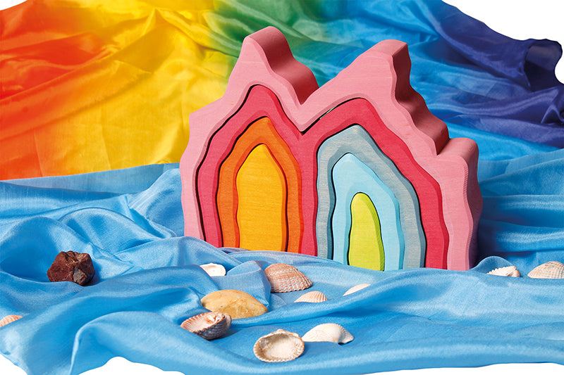 Grimm’s Toys are inspired by the Waldorf Steiner education movement which advocates learning through thoughtful, creative play at an unhurried pace. Toys play an important part of the learning experience and Waldorf toys are made with natural materials, beautiful and simplistic – the lack of details allow children to fill in the blanks with their imaginations. They can be used in multiple ways in creative play scenarios, rather than being prescriptive. Waldorf toys are wonderfully tactile and call on children to play with them.