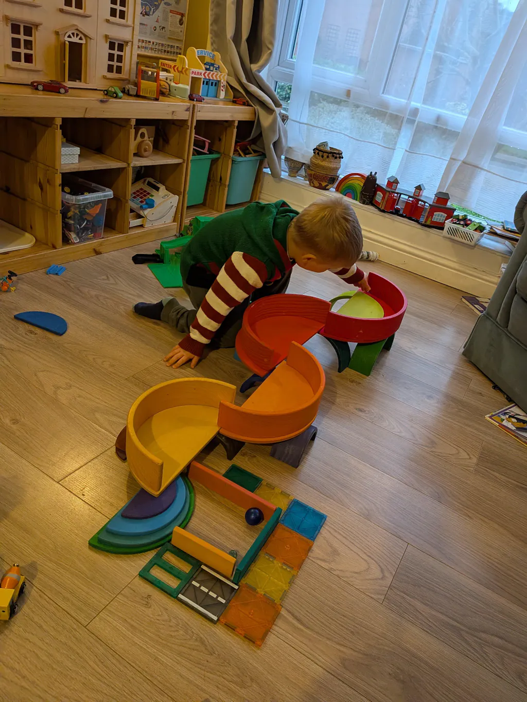 Child sitting next to a stack made from Grimms wooden rainbow semi circle and natural arch pieces