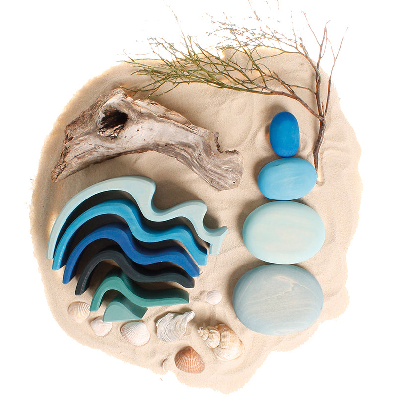 A set of 4 Grimm's wooden pebbles in a blue river colourway shown amongst a seaside themed small world play set up. There are two Grimm's friends besides teh stacked up blue pebbles surrounded by sand and shells. other wooden toys from Grimm's including waves and a monochrome stacker can be seen in the background.