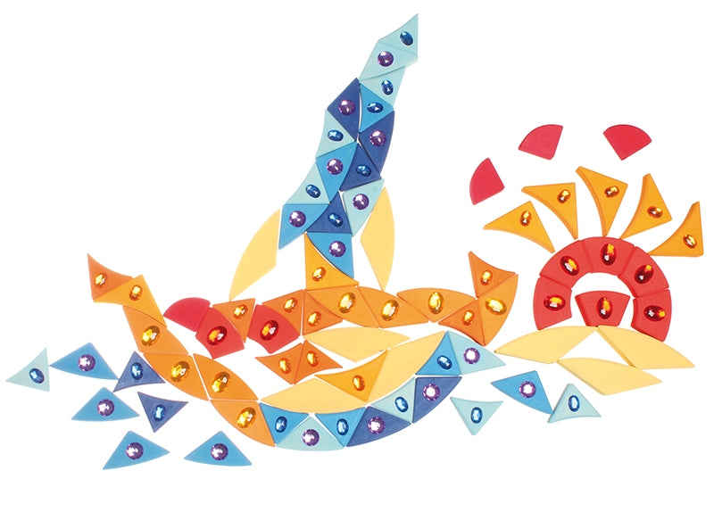 Let your creative juices flow free with this epic 76-piece bejewelled mandala block set. The colourful wooden pieces sit together in the shape of a large golden sun but can be used to make an unlimited array of dazzling patterns and sparkling images. 64 of the solid wood pieces have an acrylic glitter stone on them which gives any creation a beautiful glow. Children can enjoy building with the pieces inside the round frame or on the floor with other play blocks. This geometric puzzle is ideal for children and adults, and is a toy that really will spark creativity and encourage imaginative play.