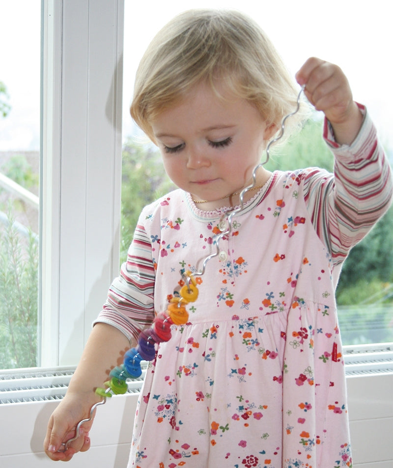 The wire is strong and sturdy and the wooden discs are made from sustainable beech and stained with non-toxic, water-based colour that allows the grain to show through.