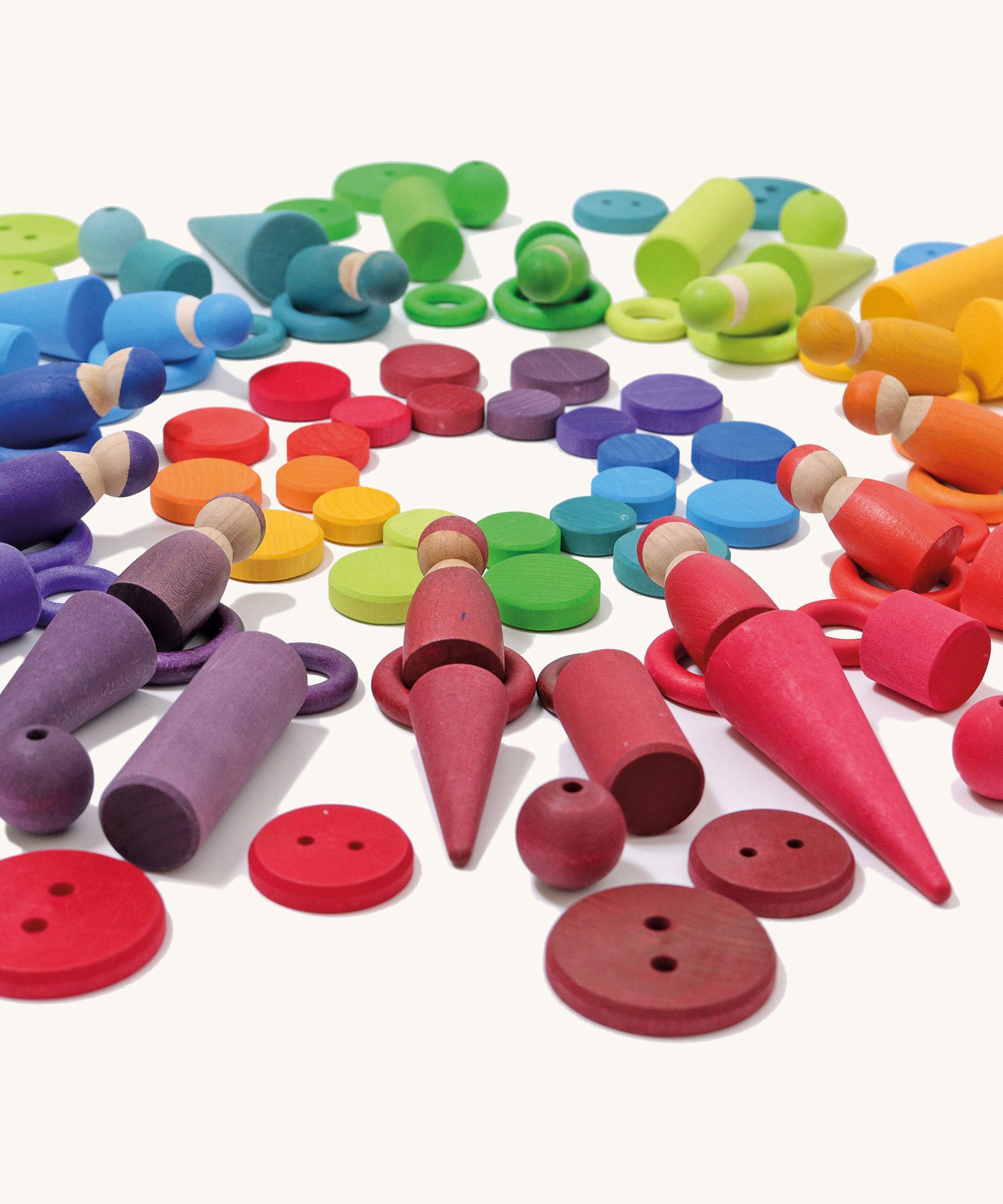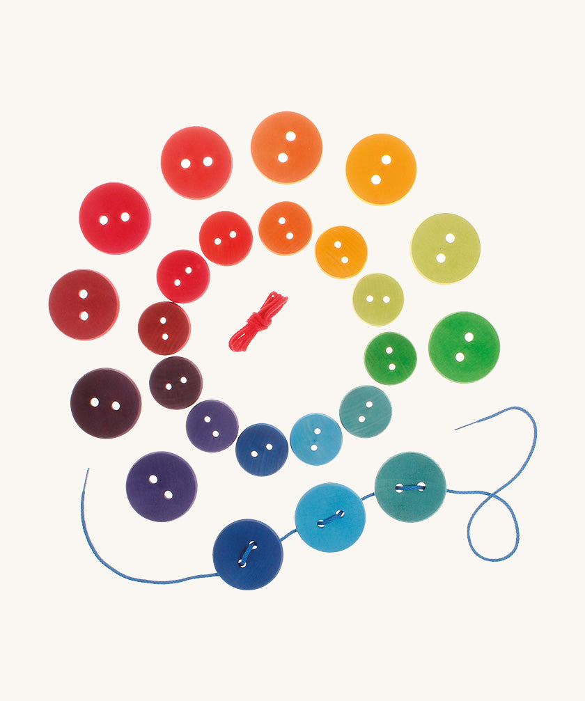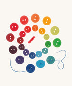 This set of 24 wooden rainbow buttons, twelve small and twelve large, can be played with in multiple ways. Use them in threading games on the strings provided or use as counters for learning maths, pretend money when playing shop, soup ingredients in a play kitchen, or combine with wooden building blocks, bobbins, peg people and figures to create beautiful rainbow worlds. This is a fun educational toy and parents, teachers and Montessori educators will appreciate the myriad of ways it can be utilised. The colours match up with a huge range of rainbow items in the Grimm's Toys range, including the famous 12-piece rainbow, making this a great set for combining with other toys for colour sorting games. Play with these wooden buttons alongside Grimm's wooden balls, rainbows, building blocks, bowls and a whole lot more for a huge range of free-play possibilities.
