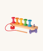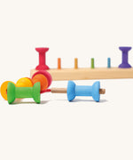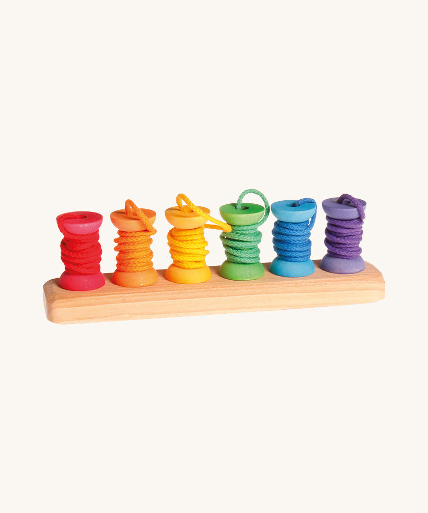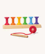 This small wooden threading game is a great educational toy that can be used in a variety of ways. Enjoy as a wooden stacking toy by pegging the six mini rainbow coloured bobbins onto the corresponding peg to practise sorting by colour or slot the bobbins onto the wooden needle to create colourful sequences. This versatile toy will hone children's co-ordination, creativity and counting skills. The colours match up with a huge range of rainbow items in the Grimm's Toys range, making this a great set for combining with other toys for colour sorting games. Combine with Grimm's wooden balls, rainbows, building blocks, bowls, buttons and a whole lot more for a huge range of free-play possibilities.