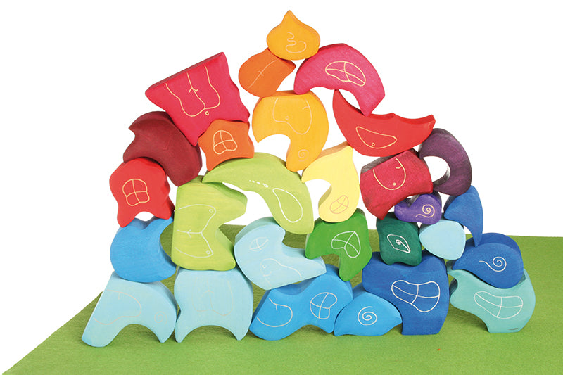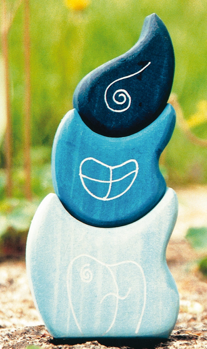 This set of three Waldorf wooden blocks set from Grimm’s are in beautiful blue shades, with the smallest one in the shape of a delicate water droplet. This set of three wooden blocks can be used as a stacking toy on its own or in conjunction with other wooden block sets to create a magical world. These tactile blocks are smooth and just the right size for children to hold. Stack the wooden building blocks up to make a fairy tower with a door at the bottom for Waldorf dwarfs to live in, or change the configuaration for more creative buildings. Who says blocks need to be standard cubes and cuboids to build with? Like almost everything in the Grimm's range of wooden toys, this set of wooden blocks is an open-ended toy and can be used creatively in many ways by children to stimulate learning - pop into a saucepan for play food, use as learning counters, practise naming colours, create wobbly furniture for a dolls' house or brightly coloured bushes on a toy farm.