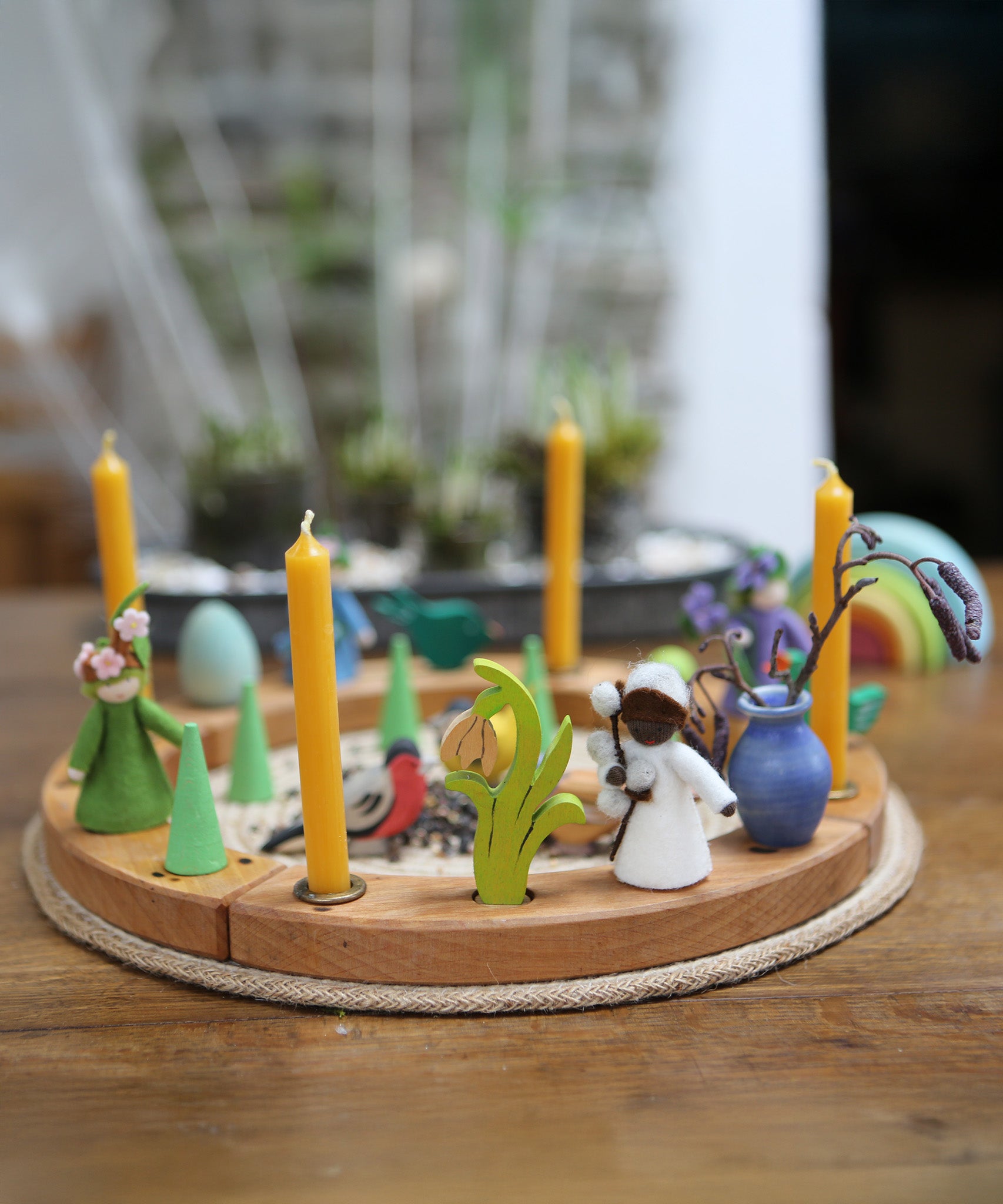 A Grimm's Wooden Celebration ring is used in a pretty winter display using Grimm's candles, Grimm's decorative figures and other loose parts. In the centre is a blue vase with flowers, and two Ambrosius dolls