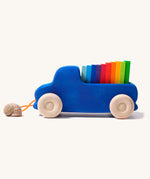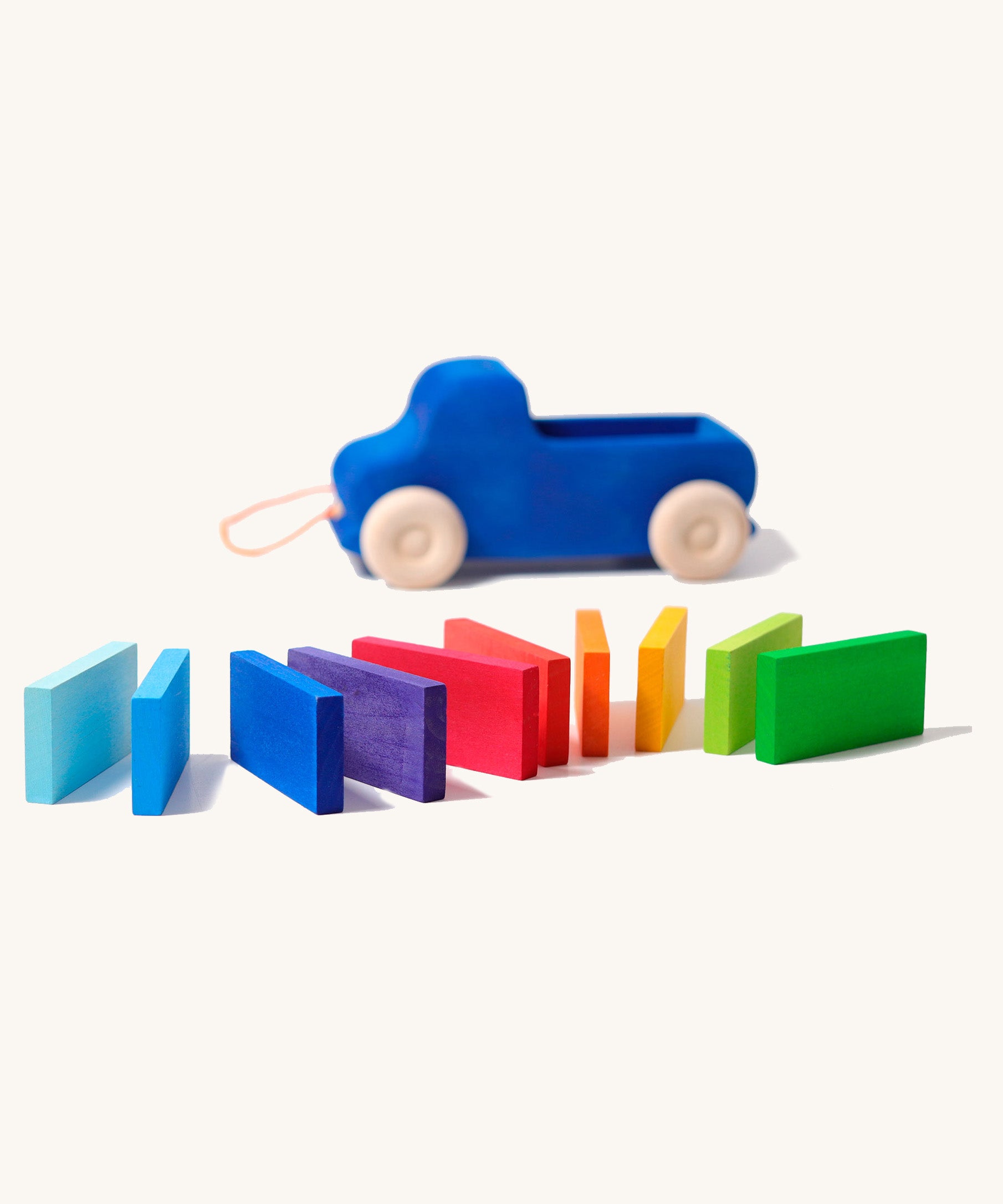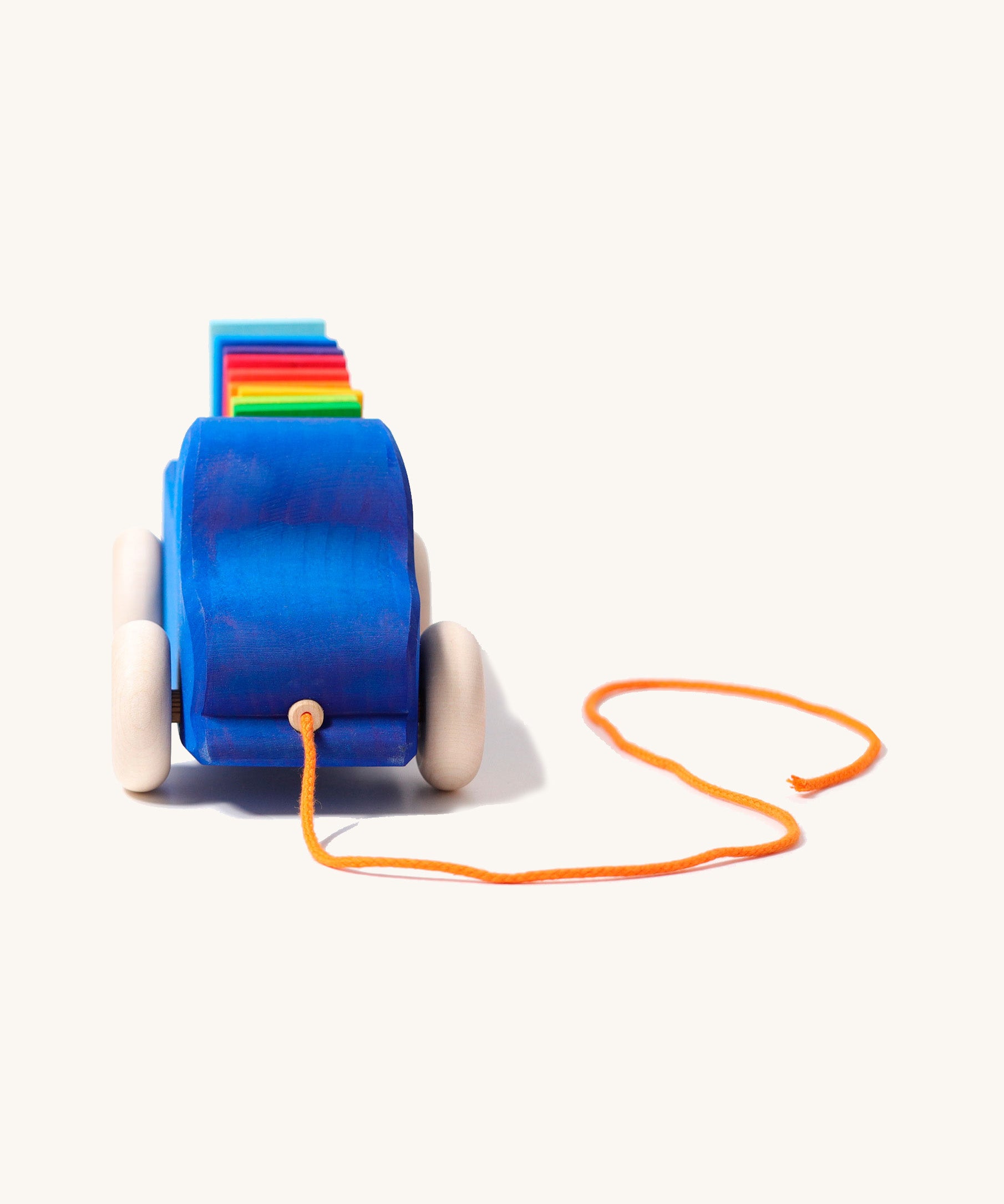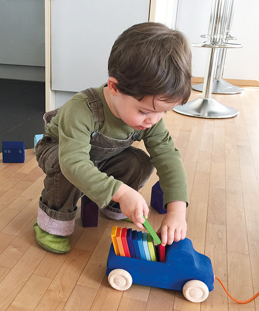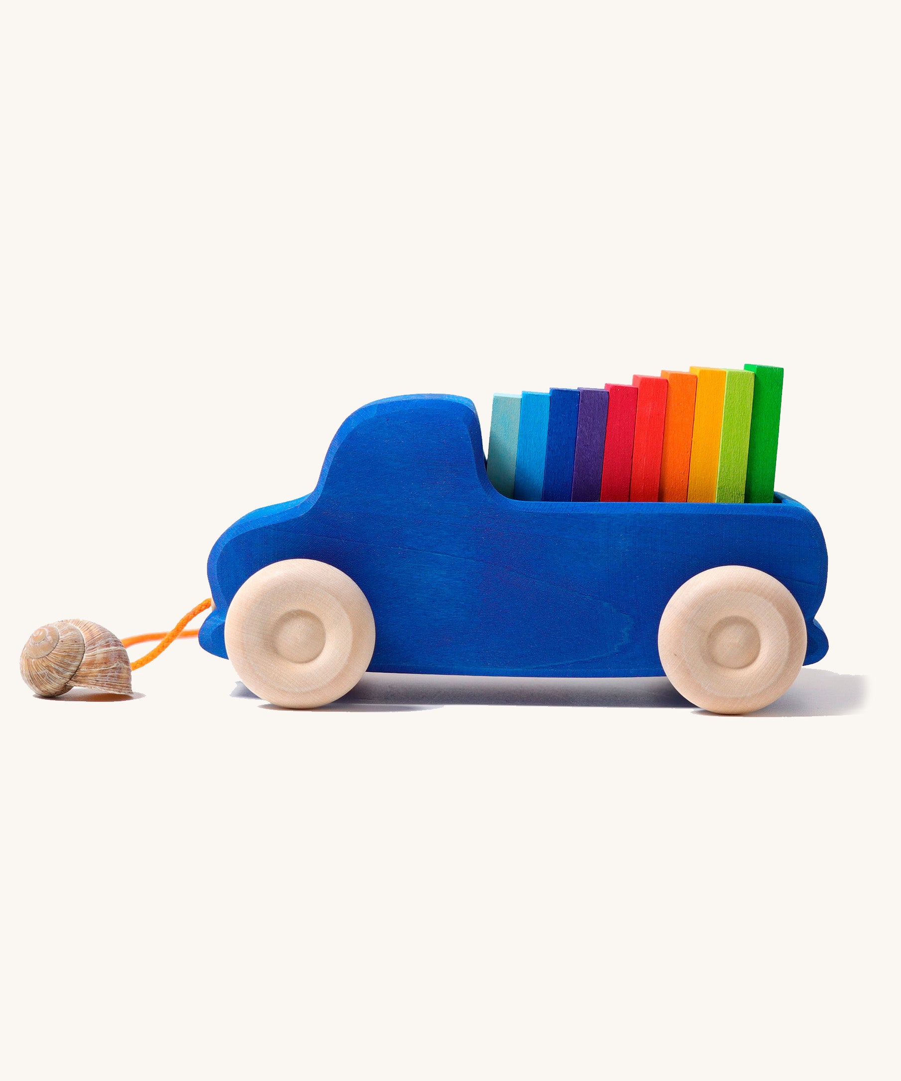 Pull, play, build and learn with this beautiful blue pull-along wooden truck with ten colour chart blocks on board. This Grimm's truck is fantastic wooden toddler toy - pull or push the truck along, unload the colour chart blocks, build a colourful construction before putting the blocks back in and moving on to a new destination. Toddlers will delight in making the vehicle move and will hone their concentration and motor skills by building towers with the blocks. Smooth, warm and tactile, each part is perfectly formed for little hands.