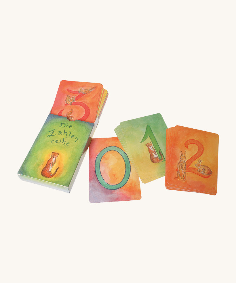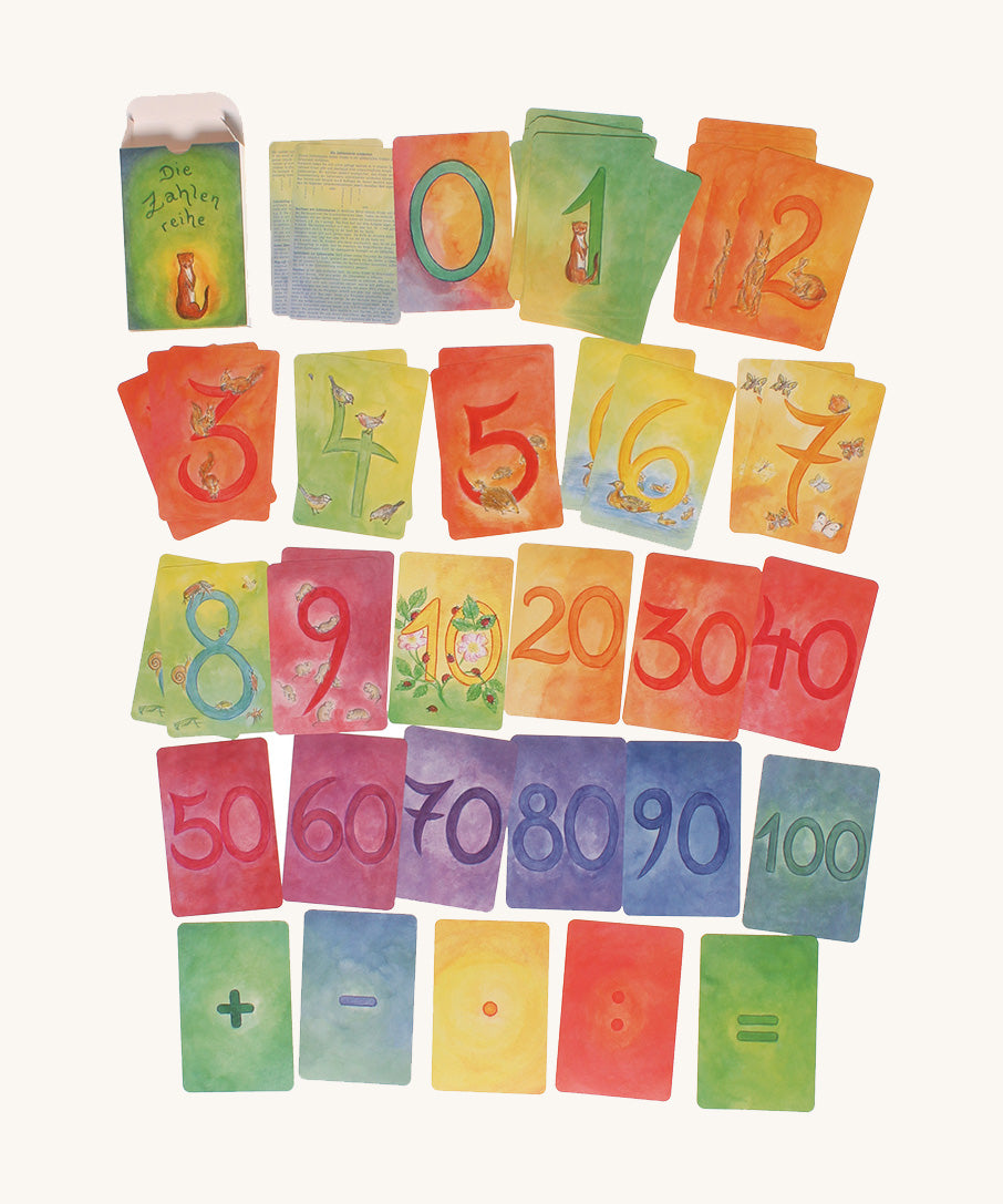 This Grimm's Card Game Number Series is a 48-card pack, each with a number or symbol on it that makes number recognition and learning maths easy. Numbers up to ten have a corresponding number of illustrated animals, turning the number from an abstract form into a concept that can be easily understood. Tots will delight in adding up the creatures on each card, learning as they play. There is one for for 0, 10, 20, 30, 40, 50, 60, 70, 80, 90, 100, +, -, x, :, =; two cards for 4, 5, 6, 7, 8, 9; and three cards for 3; five cards for 2, ten cards for 1 and ideas for play in English and German. Children, parents and teachers alike will love this card set.