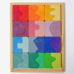 This Grimm's Concave Finds Convex Set 24 wooden blocks sit together in a large puzzle and can also be used for building with, creating images and for counting and colour sorting too. Each wooden block is a unique shape but has a piece that connects with it to make a square. Working out which pieces go together is a stimulating challenge for children and will help to develop their fine motor skills, problem-solving abilities and spatial understanding as they play. The curious shapes of these tactile wooden blocks makes this block set an ideal sensory toy.