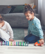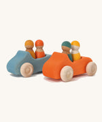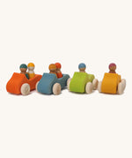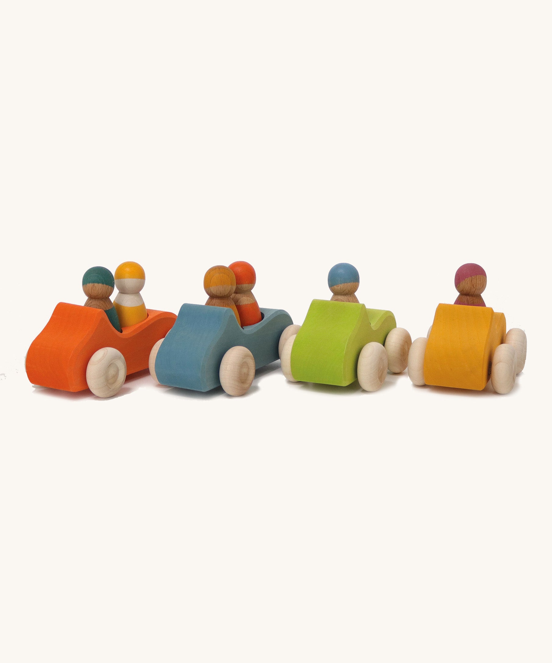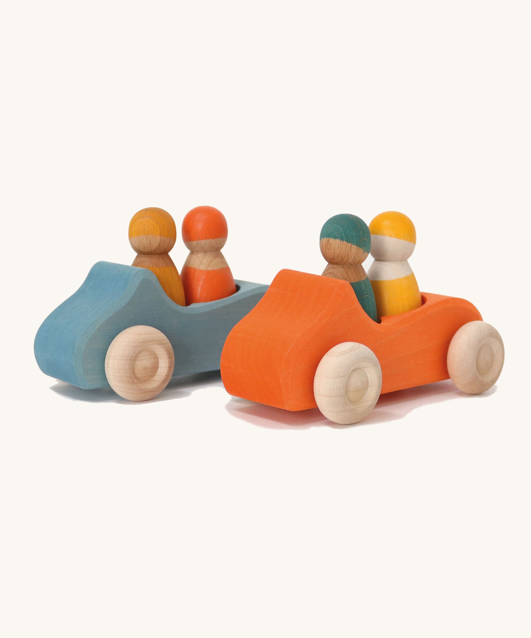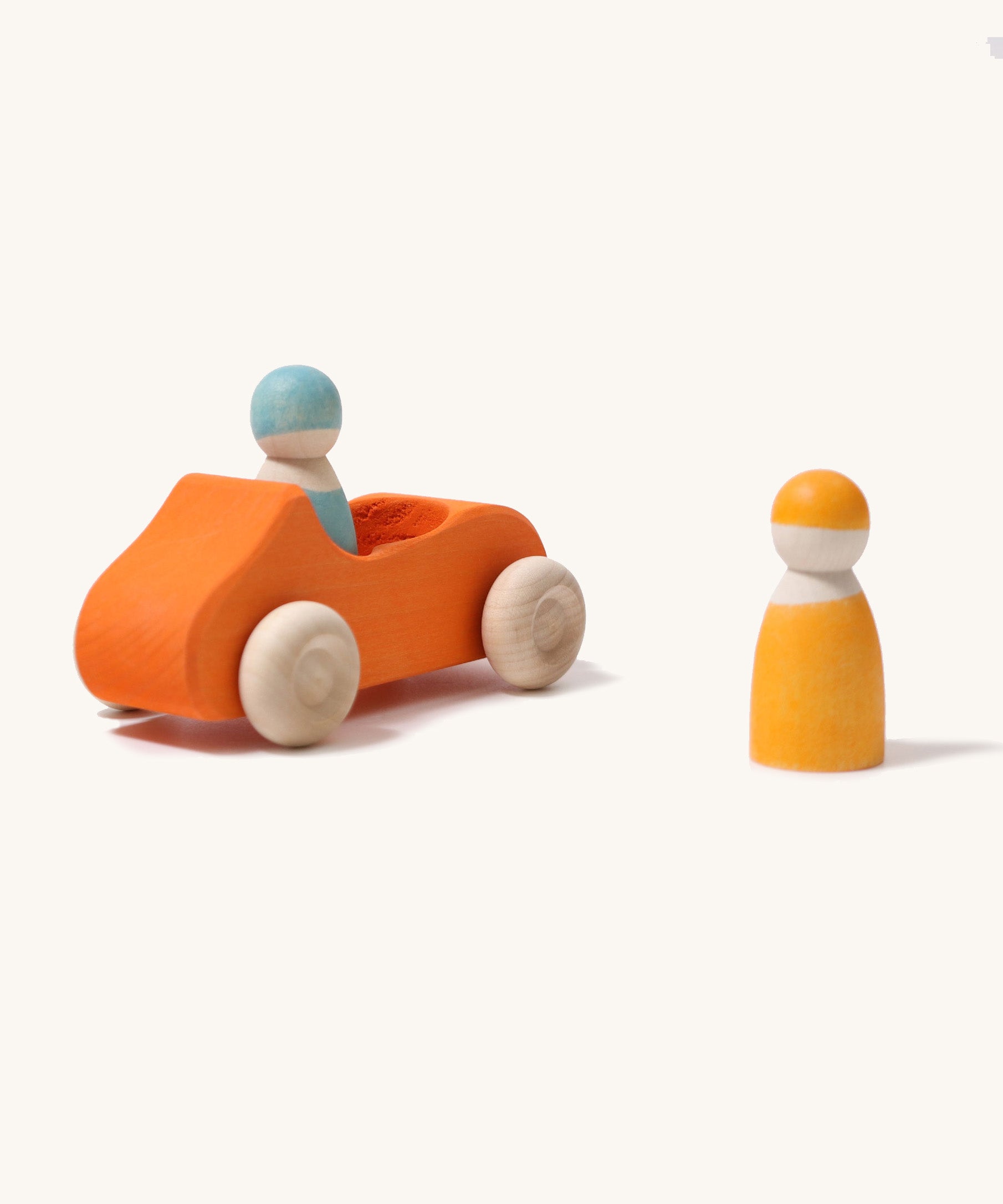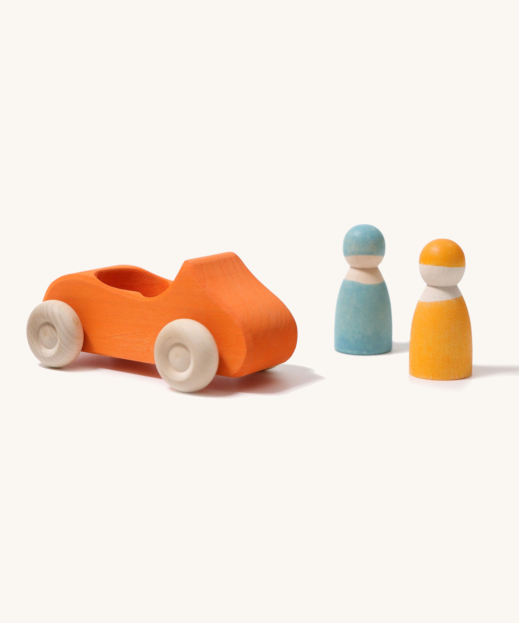 Speed off with this bright orange Grimm's Large Convertible Car - a fun wooden car with two colourful Rainbow Friends as a driver and passenger. Pop the peg dolls into the open-top car, swap them around and go for a drive across the kitchen floor. This limewood car has free-spinning wheels, left natural to show off the grain of the wood with cool blue bodywork, stained with non-toxic water based colour. This chunky wooden car is a great size for small hands to grasp and push across the floor. Push forward, pull back, take the peg dolls in and out - playing with this wooden toy car will hone toddlers' motor skills. Team up with other vehicles for family races across the floor. This handmade classic toy has been crafted by master toy makers in Germany and is a beautiful children's toy, built to last for future generations.
