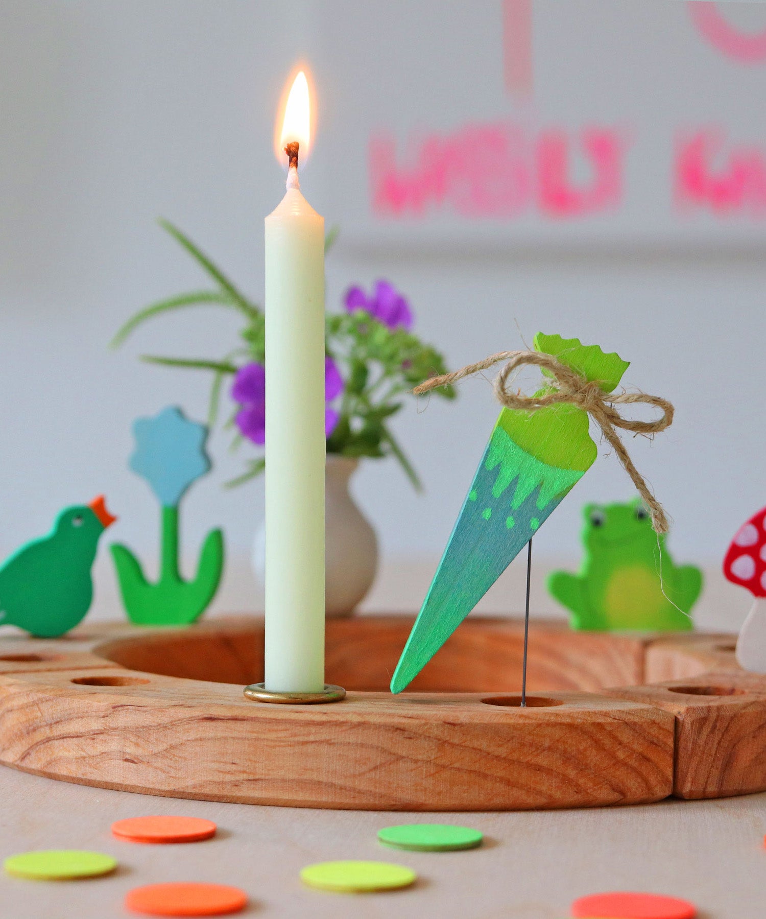 There are days in life that parents will never forget, and one of those is the first day of school! Celebrate your child's first day at school with the Grimm's Sweet Cone Wooden Decorative Celebration Figure, or 'Schultüte' in German! This school cone comes in a fabulous neon green with neon blue detailing, and has a string of twine wrapped around to mimic a real school cone.