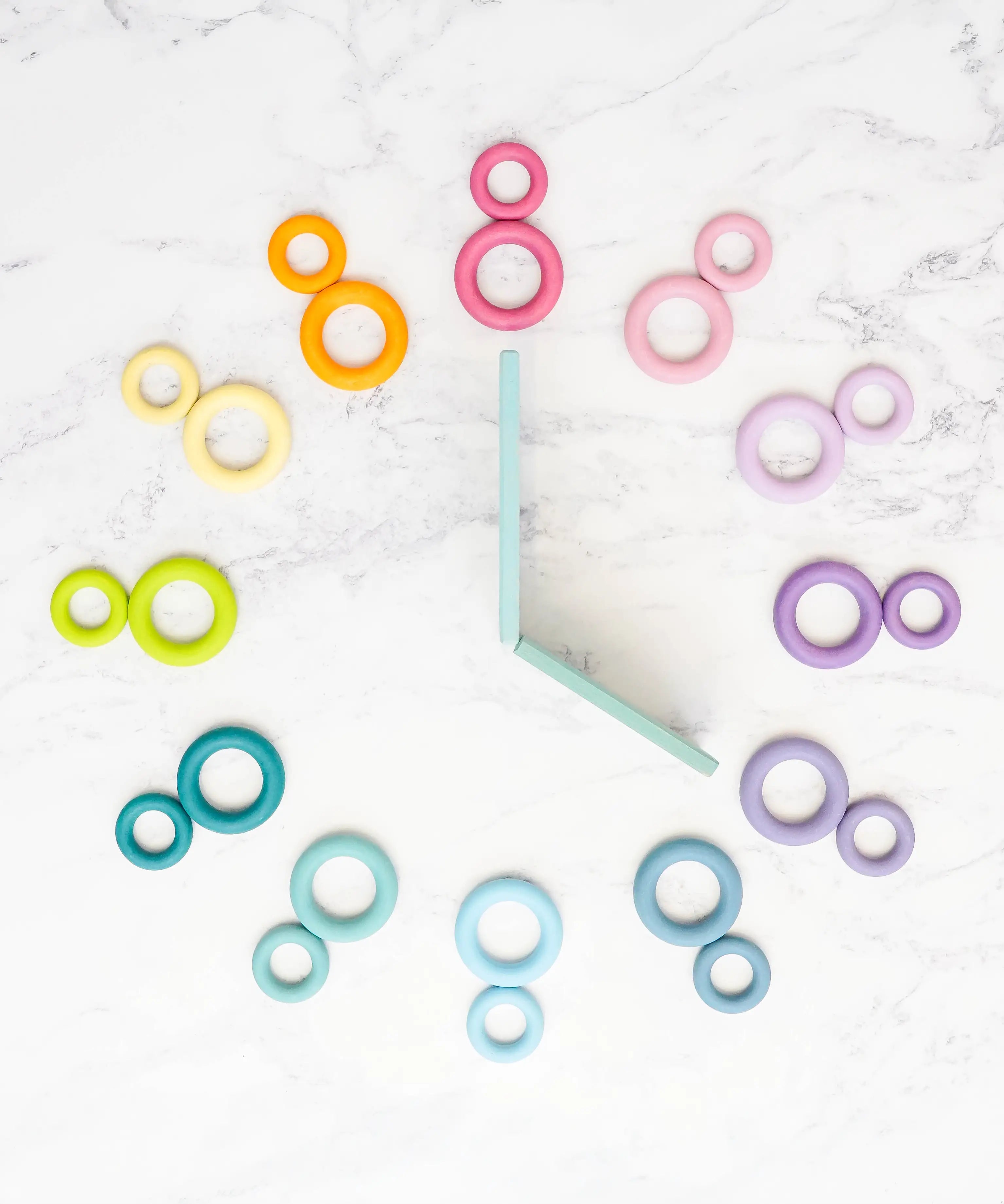A flatlay showing a clock made from Grimms wooden pastel building boards and ring pieces
