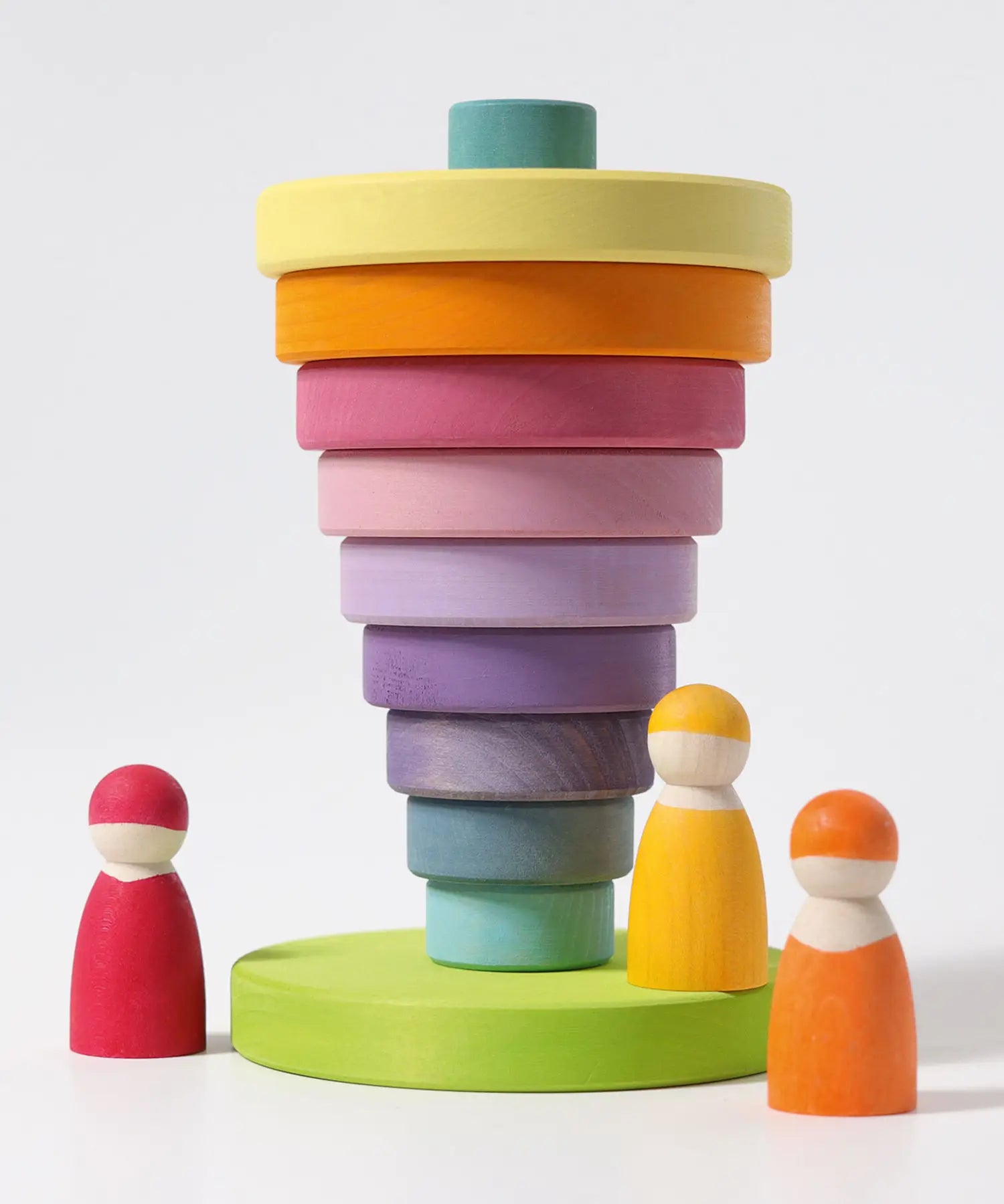 Grimms large conical tower in pastel colours showing a stack inverted on the base with peg dolls standing near