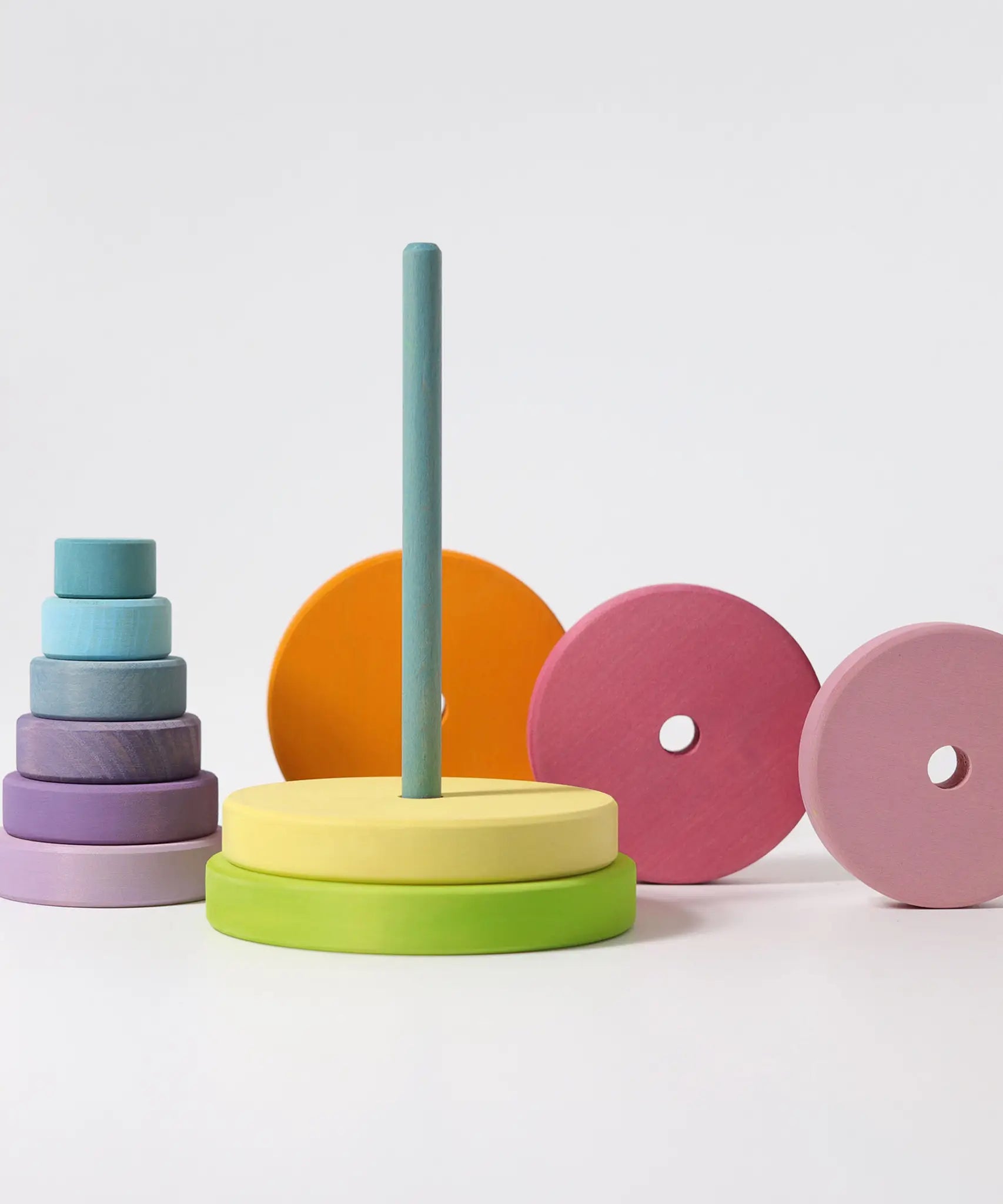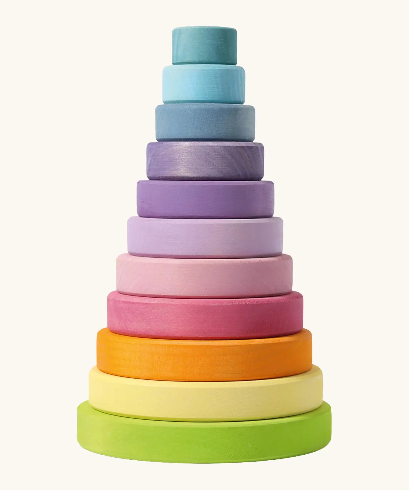Grimms large wooden conical tower in pastel colours. A 11 piece set with chunky disk pieces, a base with a peg for stacking and counting games
