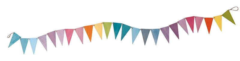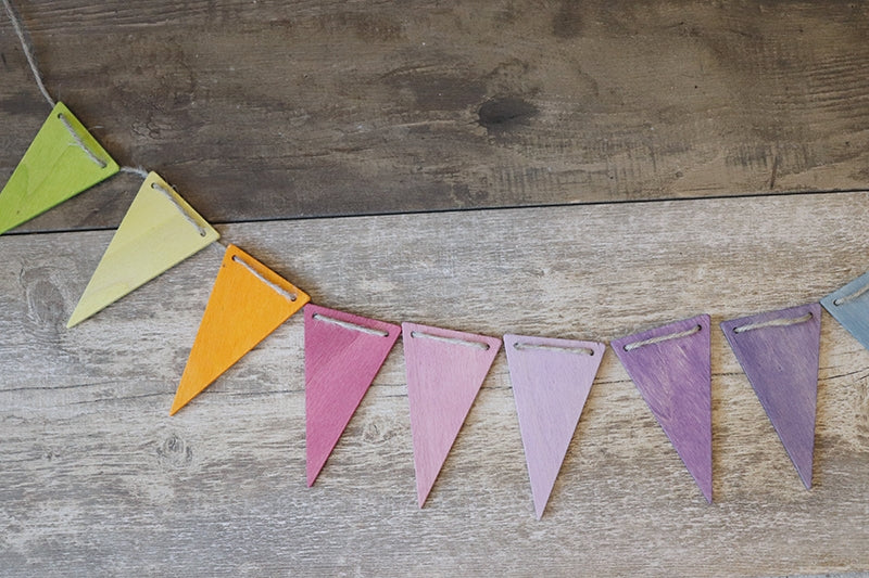 This pastel-coloured wooden bunting set includes 24 pennant flags with little holes and string to link them together. Thread the pastel pennants together to make pastel rainbow bunting - perfect for celebrating a birthday or other occasion, or to decorate your home any day of the year. This Grimm's bunting set is not a toy but will perfectly a child's nursery or playroom filled with pastel rainbow toys.