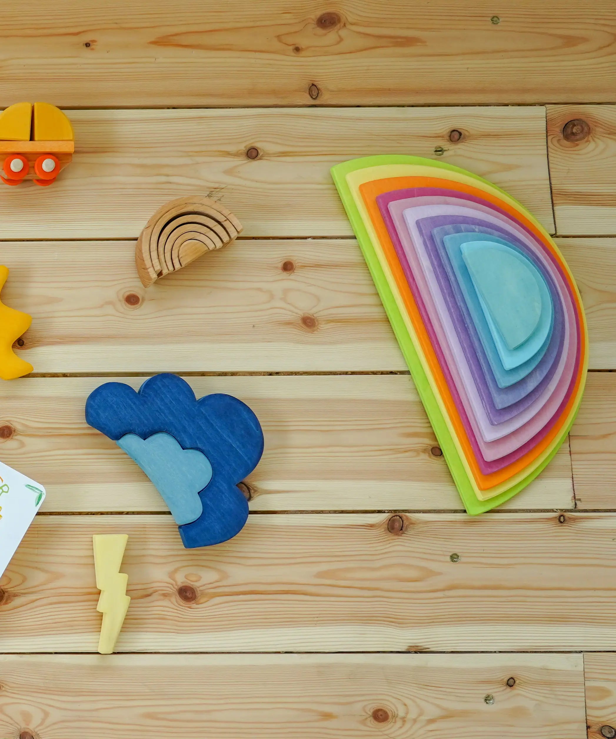 Flatlay showing a Grimms pastel semi circle set on a wooden floor next to other loose building blocks