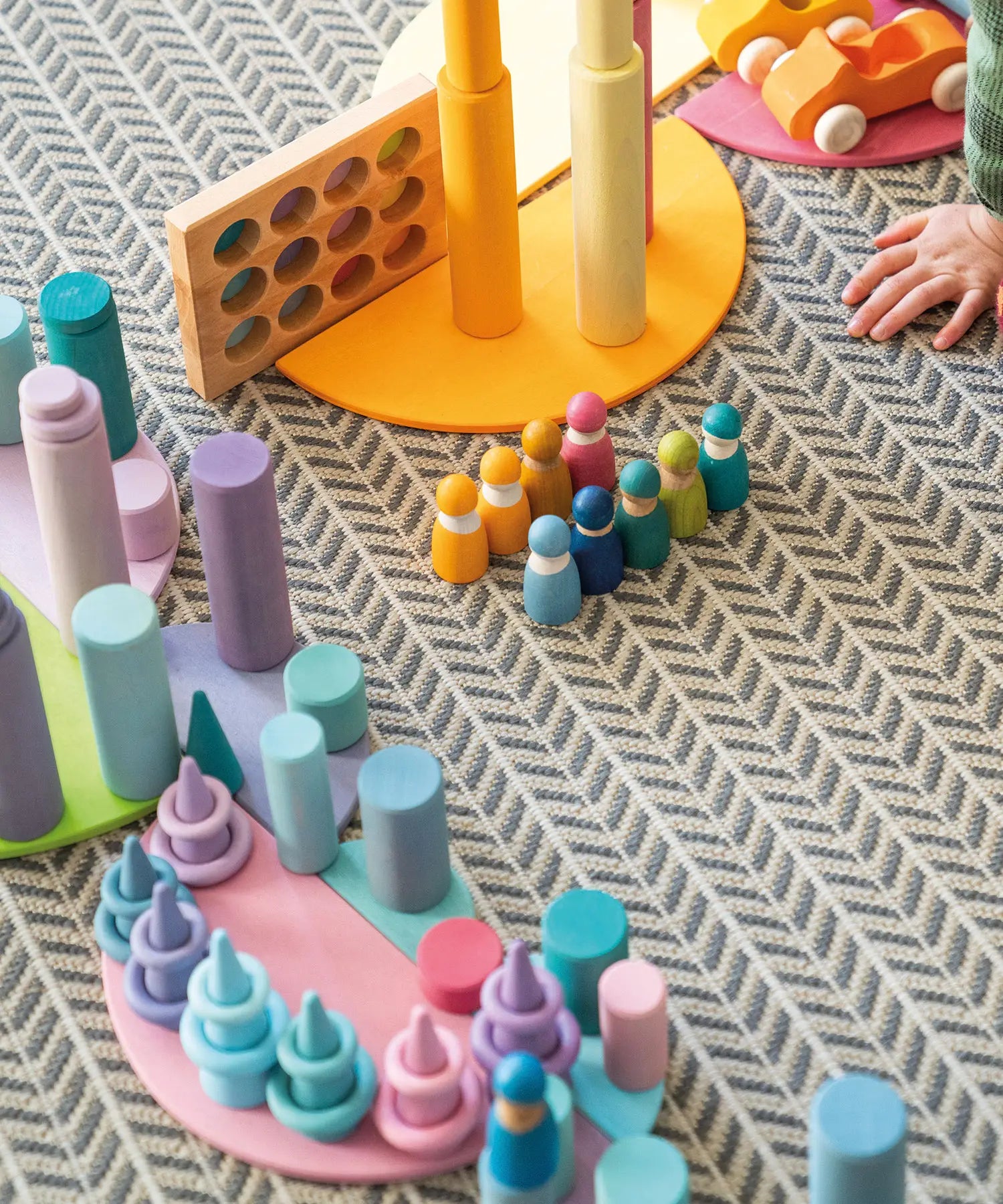 Play setup using various Grimms wooden pastel building blocks and loose pieces