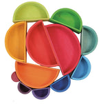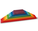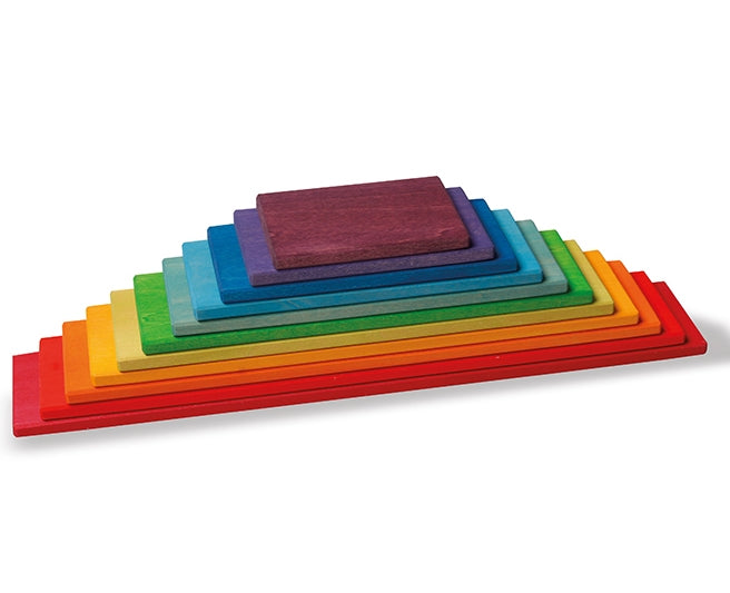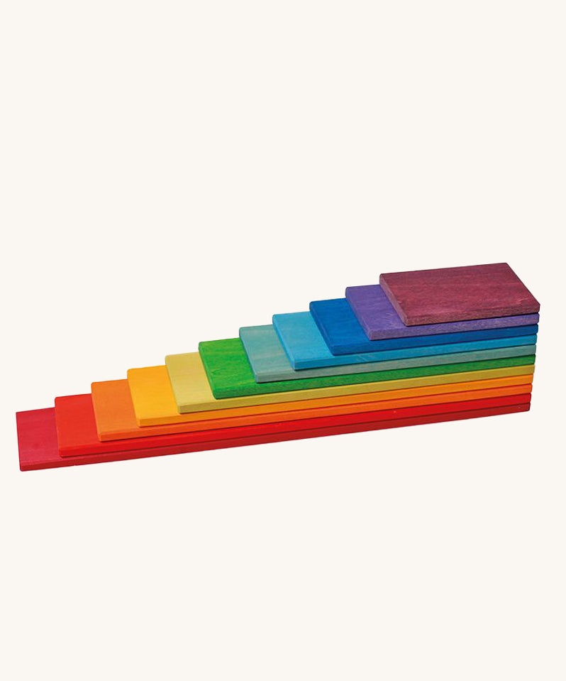 This set of 11 wooden boards stained in bright rainbow colours are the perfect fit for the 12-piece Grimm's rainbow and semi-circles - combine all three to make rooms for a dolls' house, stables and sheds on a toy farm, or wonderful worlds for peg people. Or just use with the rainbow to learn about weight and balancing. Creative children will find a whole load of other ways to incorporate them into building games and making patterns, and they're also great as counting aids, for colour sorting and as ingredients in a play kitchen. This simple open-ended toy can be used in a myriad of ways to inspire creativity and learning.