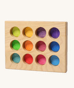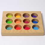 This Grimm's Rainbow Sorting Board is a beautifully crafted wooden sorting tray, with twelve round slots stained in bright rainbow colours that are just the right size for slotting in Grimm's Rainbow Friends and Small Rainbow Balls, and can also be used for wooden marbles and little treasures used for mandala making and colour sorting games - all of these toys are sold separately at Babipur. This tray has been expertly handcrafted by master toy makers in Germany using sustainable alder wood and treated with a non-toxic, plant-based oil finish. Each slot has been stained a vibrant rainbow colour to make colour sorting activities easy.