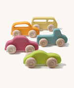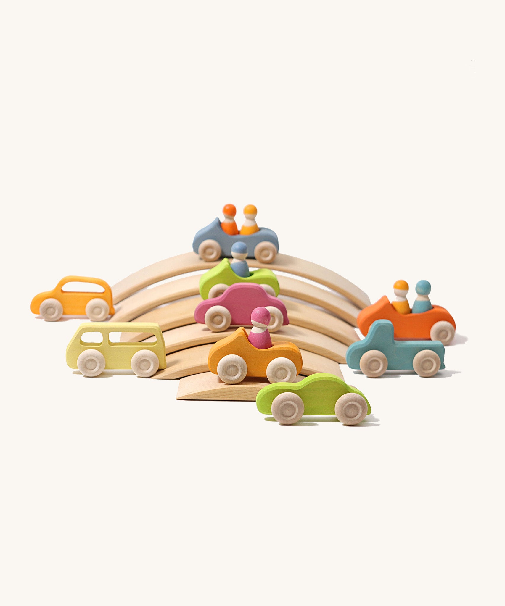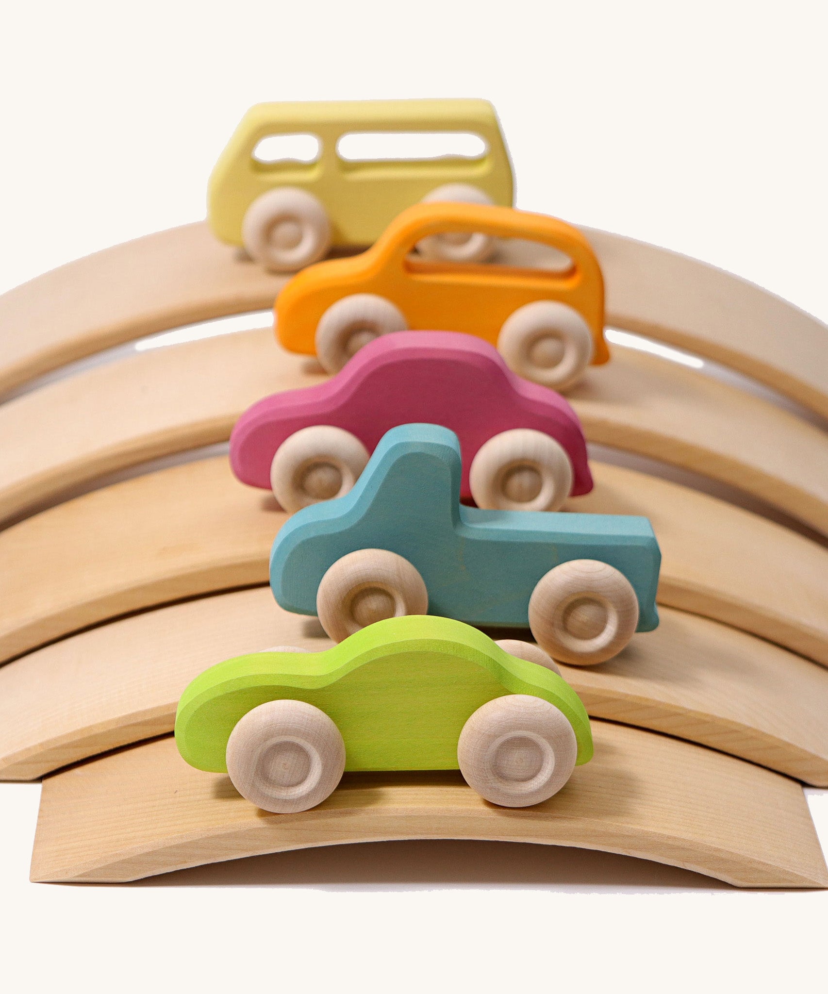 This set of five Grimm's Slim Wooden Cars are great fun for little drivers to push and pull across the floor and includes three cars, a pick-up and a classic camper. Each wooden car is ethically made from sustainable lime wood and stained pastel rainbow shades using non-toxic water based color stain with natural wheels. These slim-line vehicles are perfectly sized for driving over narrow Grimm's bridges and ergonomically designed to be easily grasped by young children's hands. With a little imagination, these wooden toy cars can be used as fire engines, school buses, police cars and ambulances. They come in different shapes to represent the range of vehicles on the roads and will be a favourite play set with mini motoring fans. Toddlers and young children will love to take them all for a drive and with a set of 5, there's plenty for siblings, friends and classmates to enjoy together.