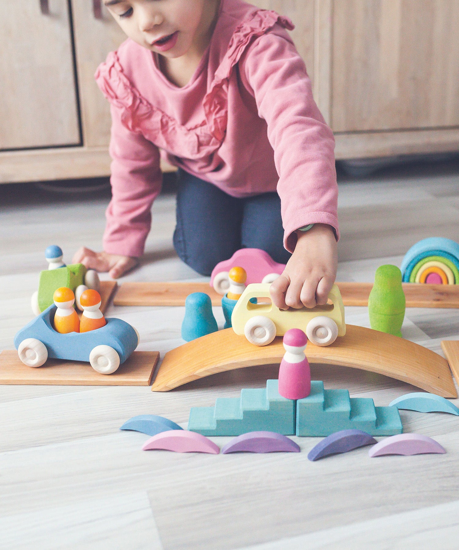 Featuring toys to shake, build or pull along, Babi Pur’s range of Grimm’s Waldorf-inspired toys has something for every child to fall in love with. The quality of these toys is superb and their appeal is timeless – we’re sure that they will be treasured not only by your children but by your grandchildren too. Grimm’s Toys are inspired by the Waldorf Steiner education movement which advocates learning through thoughtful, creative play at an unhurried pace. Toys play an important part of the learning experience and Waldorf toys are made with natural materials, beautiful and simplistic – the lack of details allow children to fill in the blanks with their imaginations. They can be used in multiple ways in creative play scenarios, rather than being prescriptive. Waldorf toys are wonderfully tactile and call on children to play with them.