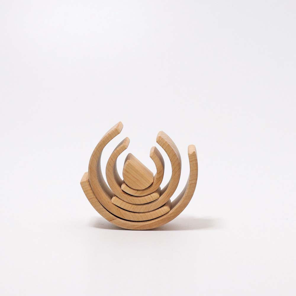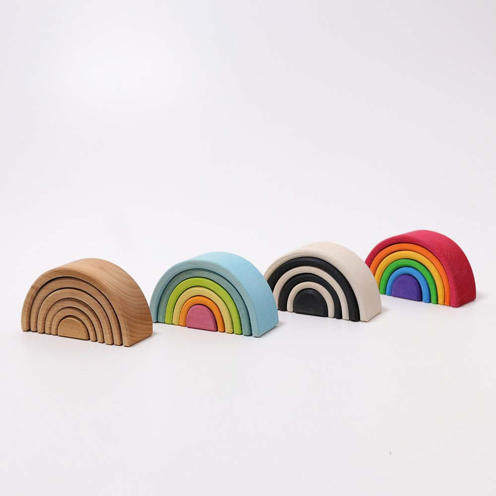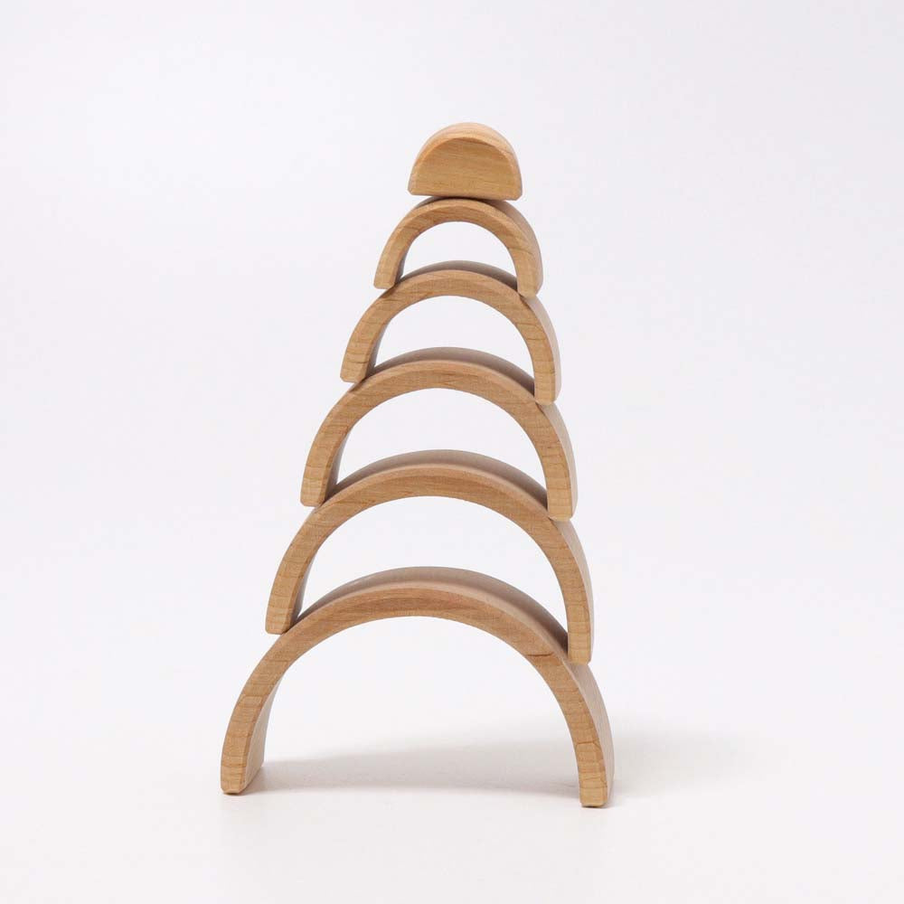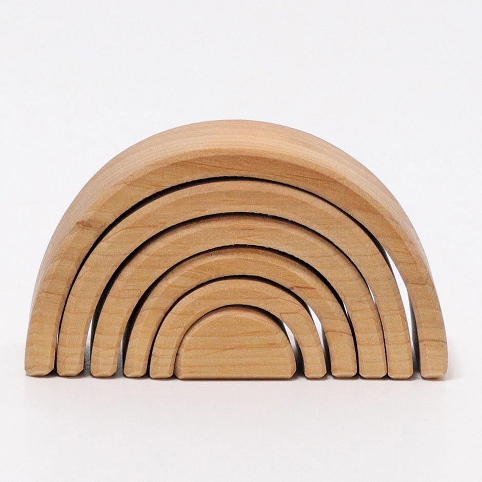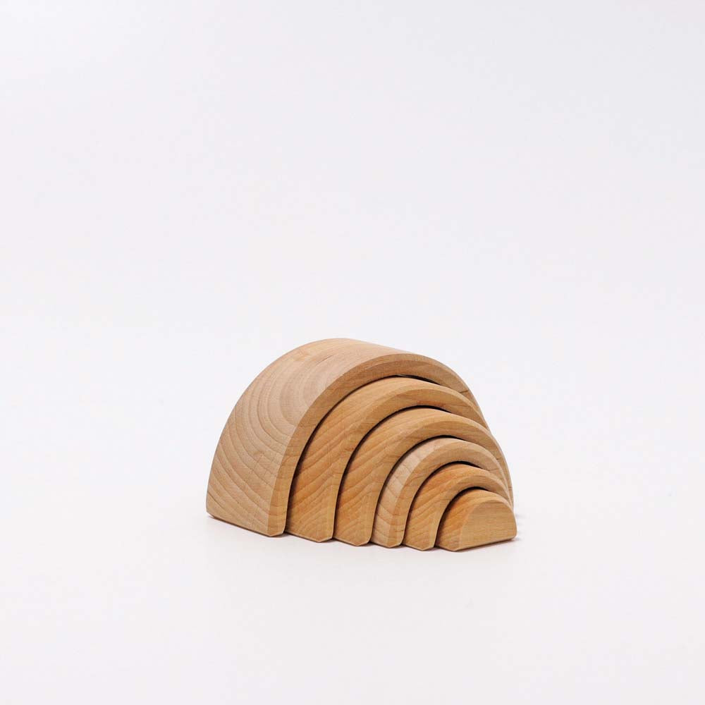 This Grimm's Mini Natural Tunnel is a beautiful wooden stacking toy, with six natural wood rainbow arches that slot together. This small-scale rainbow stacker is cut from a single piece of lime wood and can be used in multiple ways for learning through play. Make a natural rainbow tower or use the individual pieces as beds for dolls and wooden animals, bridges and tunnels for toy cars, fences for a toy farm. Combine with other Grimm's rainbows to make a marble run and create images, and stack in intricate ways to build amazing sculptures.