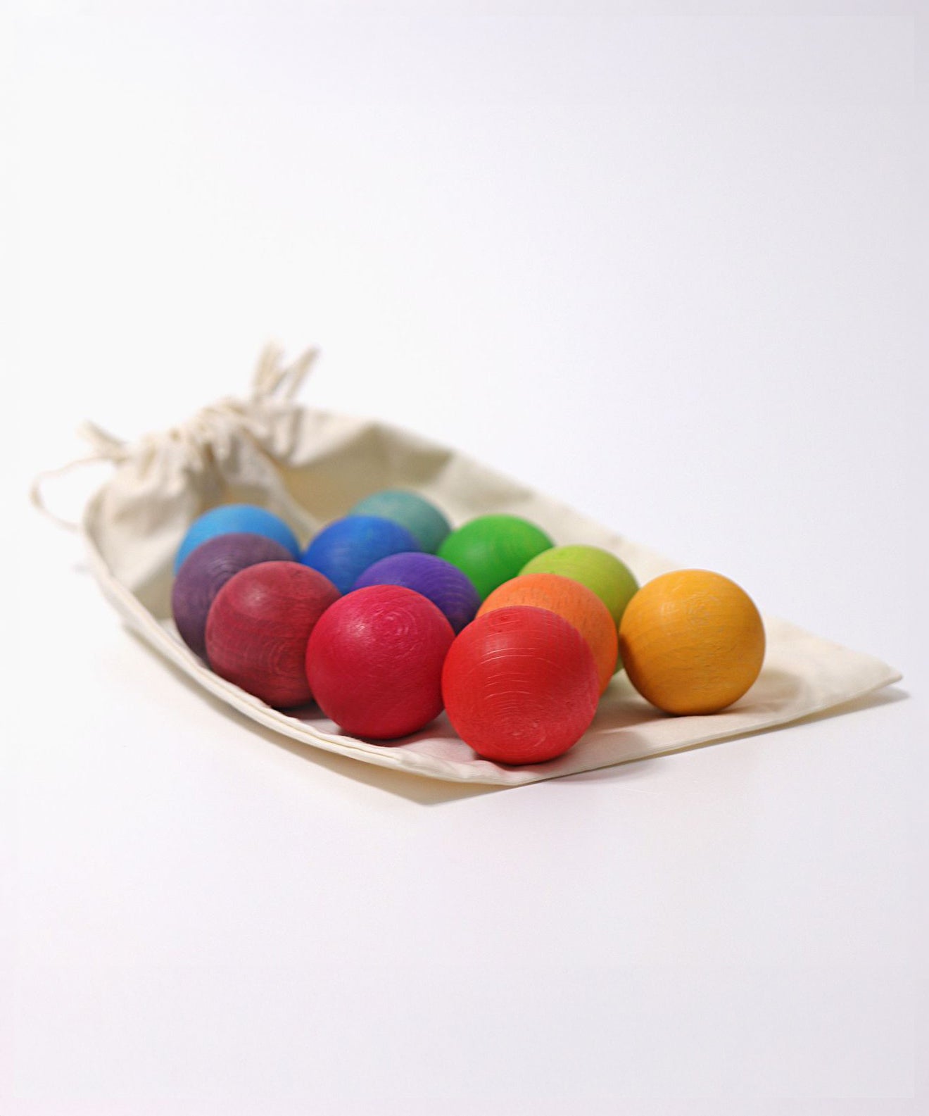 These twelve Grimm's Small Rainbow Balls are smaller than Grimm's standard balls but bigger than marbles and are just the right size for for ball runs. These brightly coloured balls are a perfect match for Grimm's rainbow toys in the range. This set of 12 wooden balls are great fun for children to throw, roll, catch, hide under pots and use creatively in making mandalas. Imaginative children will love to use them as pretend money and ingredients in a play kitchen, and they are great for teaching colours and how to count too. Smooth and tactile, these balls are appealing to children of all ages and Montessori followers will love how they can be played with in multiple ways.