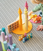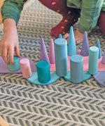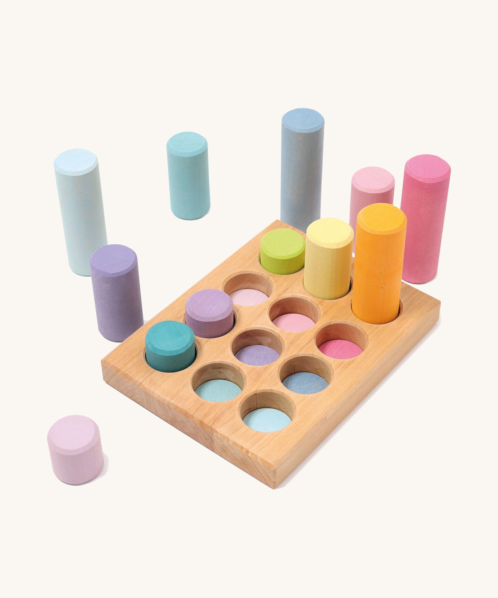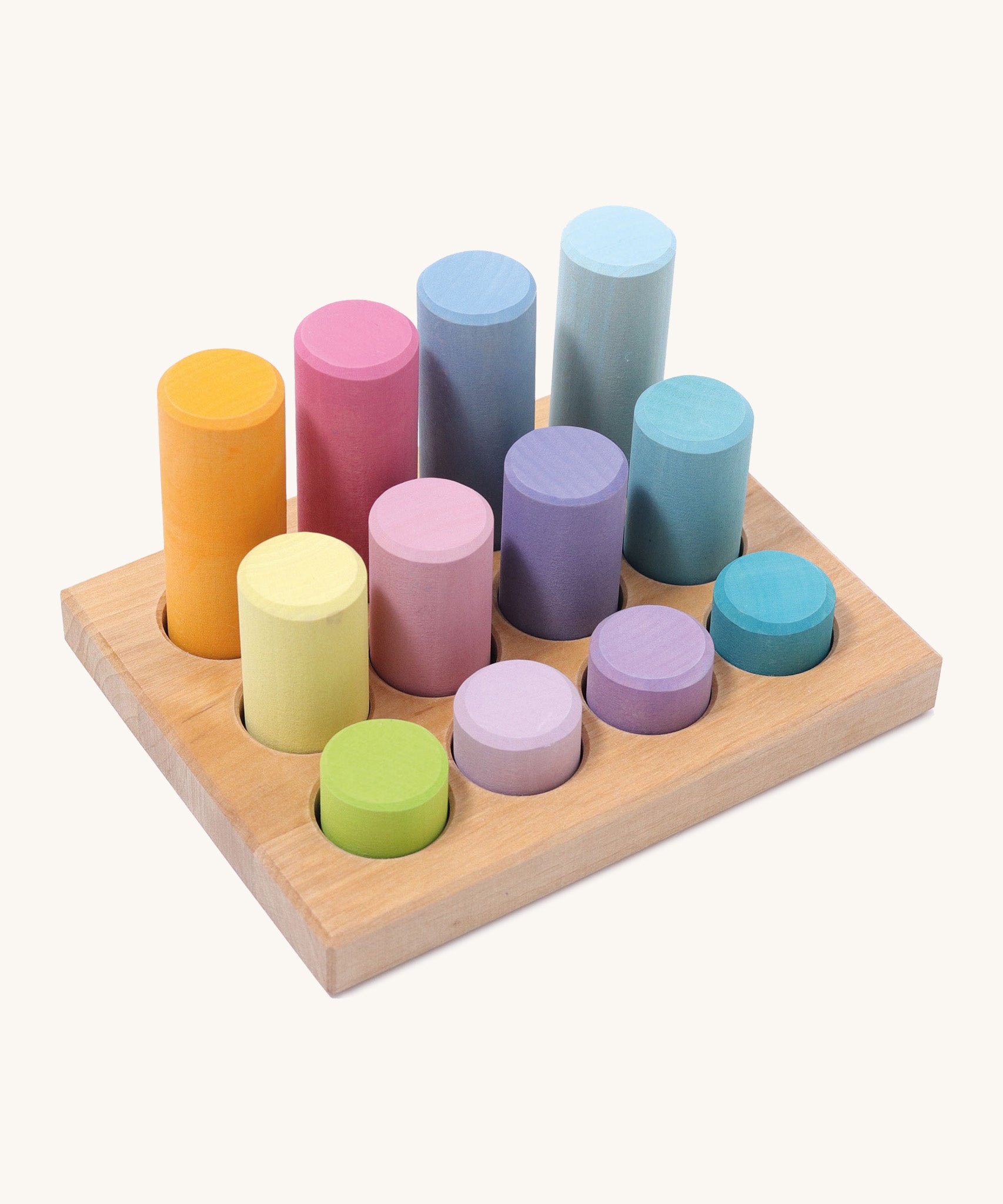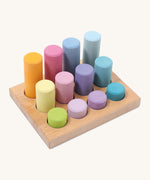 Pastel rainbow fans will love this Grimm's Pastel Small Rollers Stacking Game – made up of 12 solid wood cylinders of varying heights and an expertly handcrafted wooden sorting tray, with twelve round slots stained in pastel rainbow shades.
