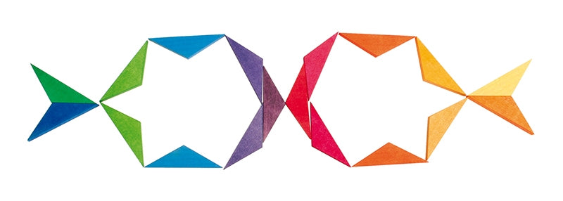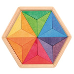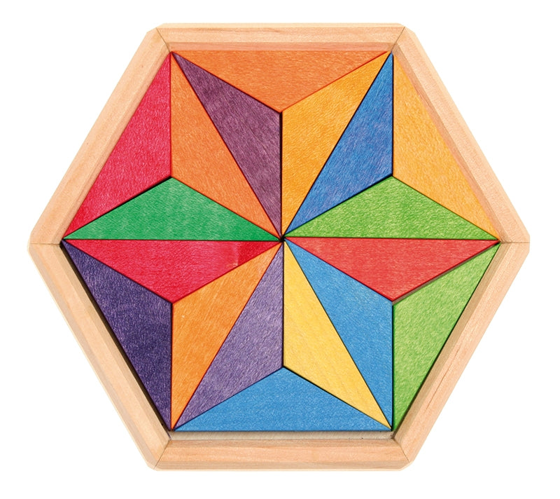 This 18-piece wooden puzzle in the shape of a star sits in a hexagon frame and is perfect for children who love to get creative, build and design patterns. Sort by colour and make images and designs within the frame - it's perfect for playing with on the go. The wooden triangular pieces can also be used in a whole load of other ways - in colour sorting games, as maths aids, as shrubs on a toy farm or ingredients in a play kitchen. Let your child's creativity flow with this Grimm's wooden puzzle.