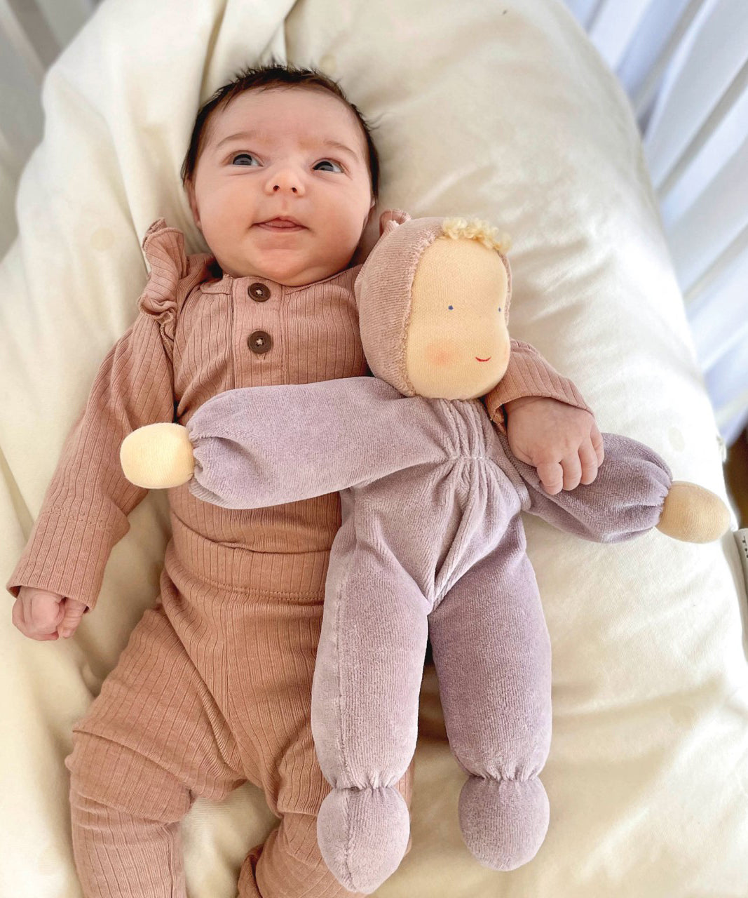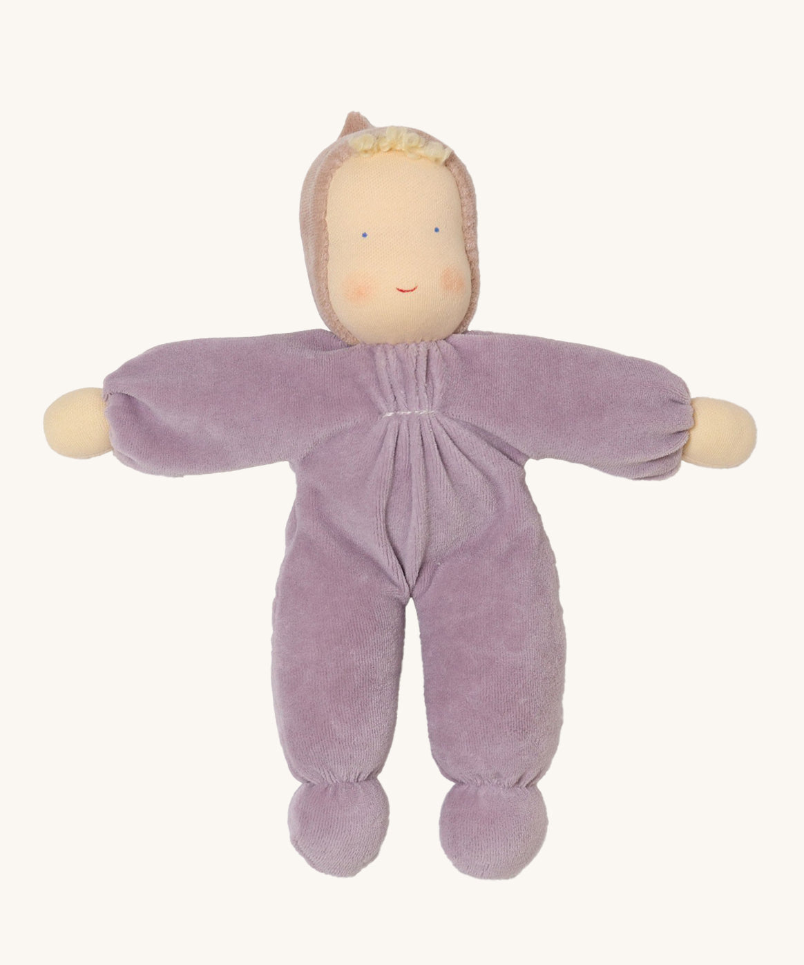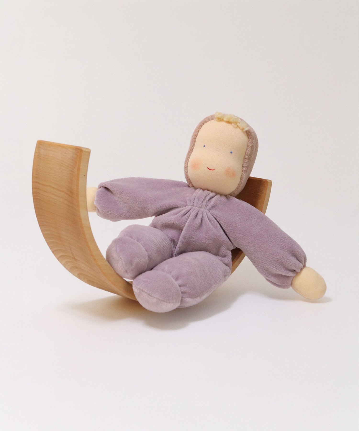 Beautifully soft cotton doll in a classic Waldorf stye that appeals to young children. This Grimm's Viola soft doll has white skin and curly yellow hair and wears soft violet purple clothing.