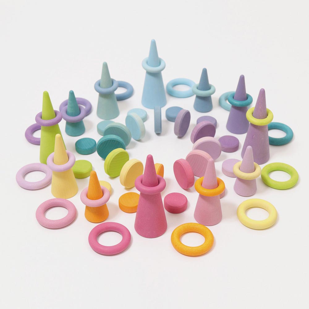 This Grimm's Pastel Coins set includes 24 wooden coins in two different sizes and in a beautiful blend of pastel rainbow shades