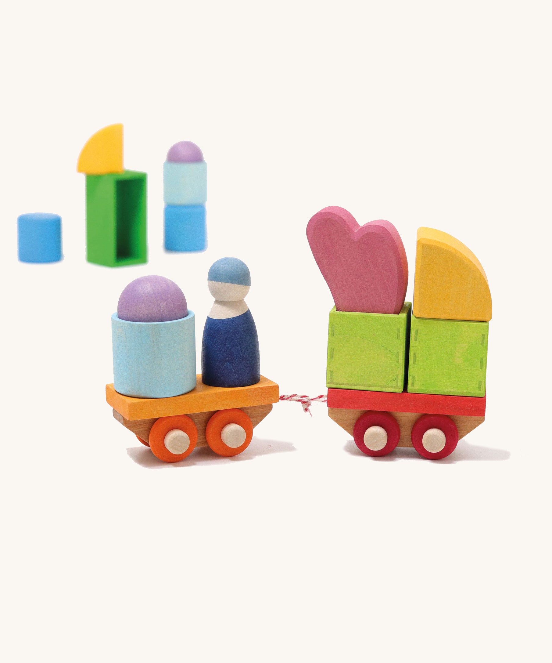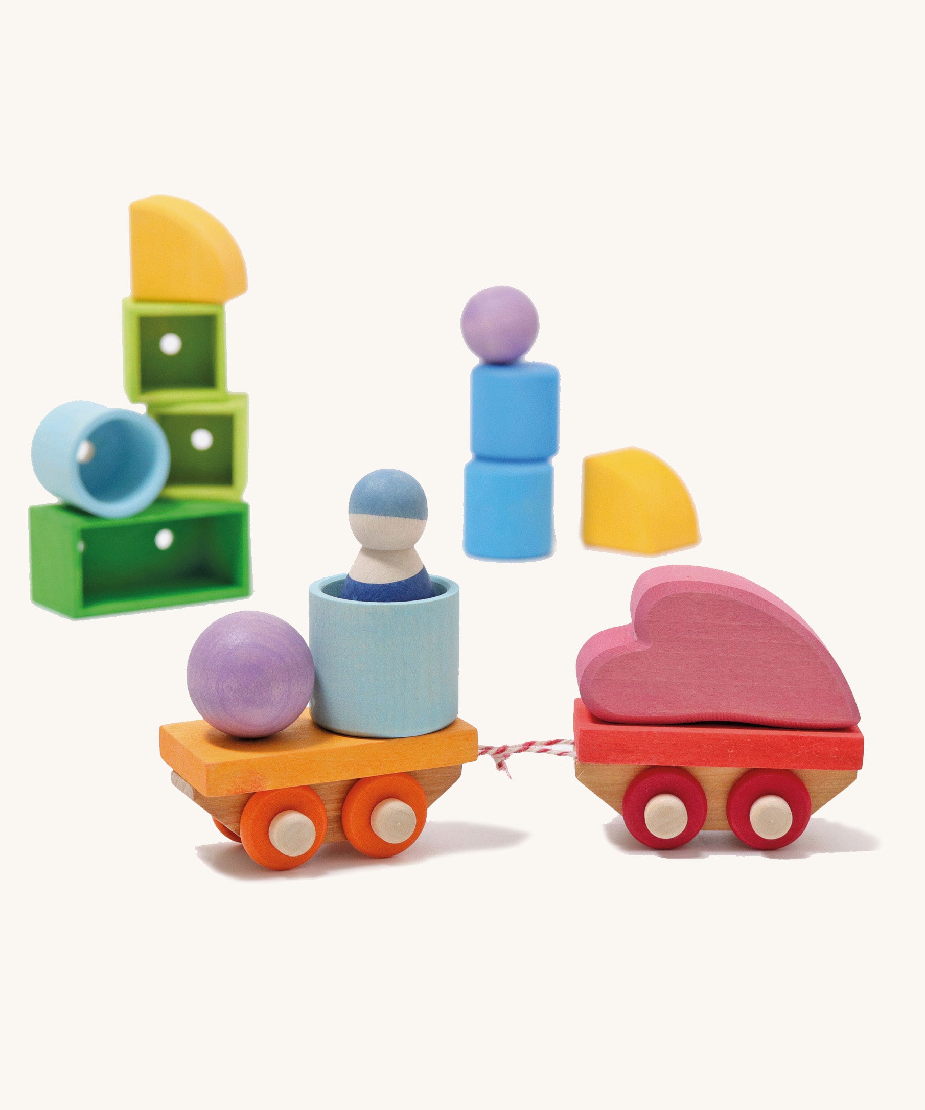This colourful wooden Grimm’s train set is made up of two main train parts in solid natural wood finish with two dowels each for slotting on wooden blocks and freight. This wooden train set will run on all standard wooden train track or on flat surfaces. This wooden toy comes with 17 individual parts in different shades of blue, yellow, green and purple that slip over the dowels to create an engine and cargo or passenger carriages. Each train set includes a Grimm’s Friend driver, five hollow boxes of different shapes to hold freight, solid blocks to slot onto the carriages a wooden heart block and two small wooden balls. The train carriages simply link together using the string provided – loop the string over the dowels and fix with the base plates. This is a traditional wooden toy that children will enjoy sitting down with on the floor for hours of quiet play. It is ethically made from solid wood and finished in water-based colour stain which retains the natural features of the wood. FSC certified European wood.