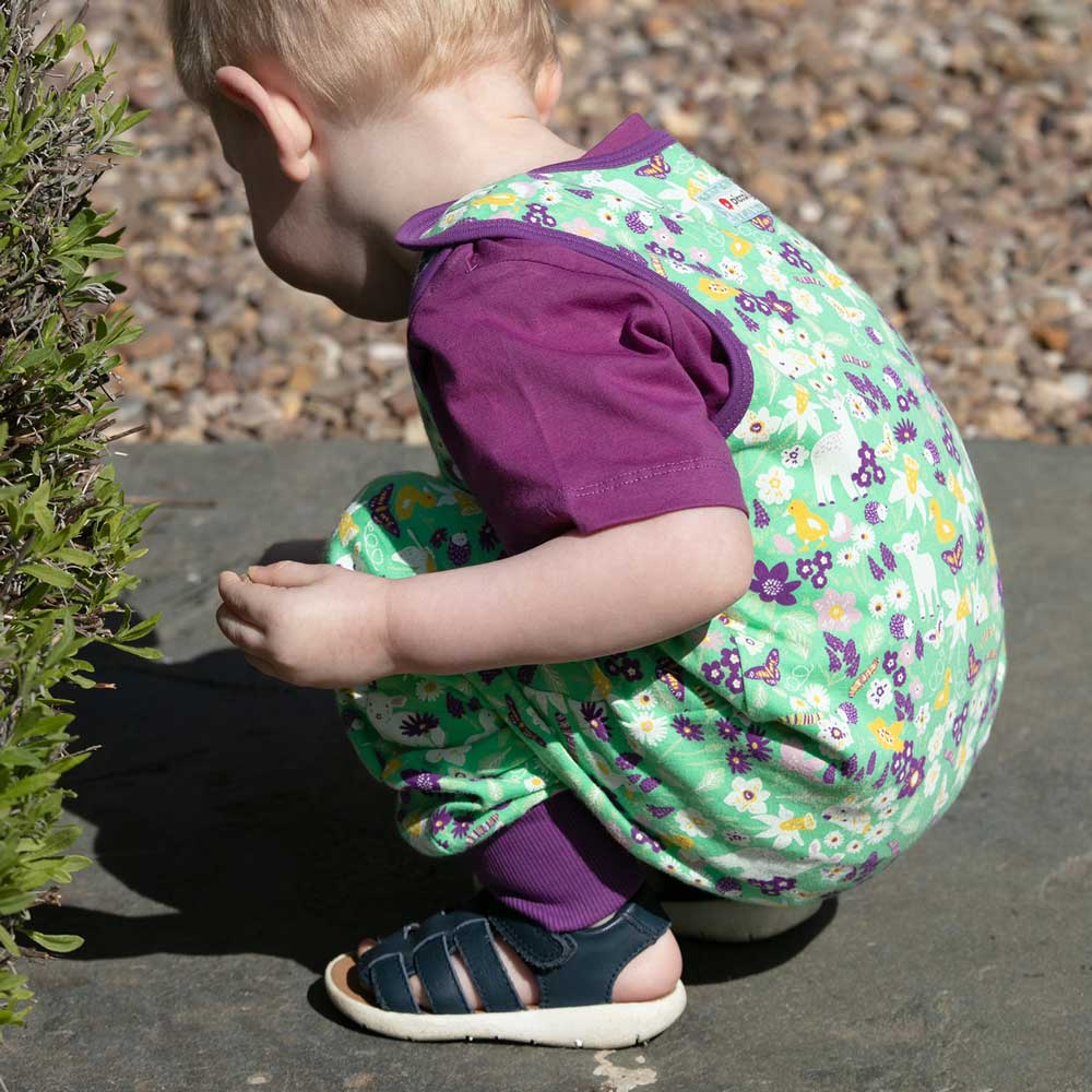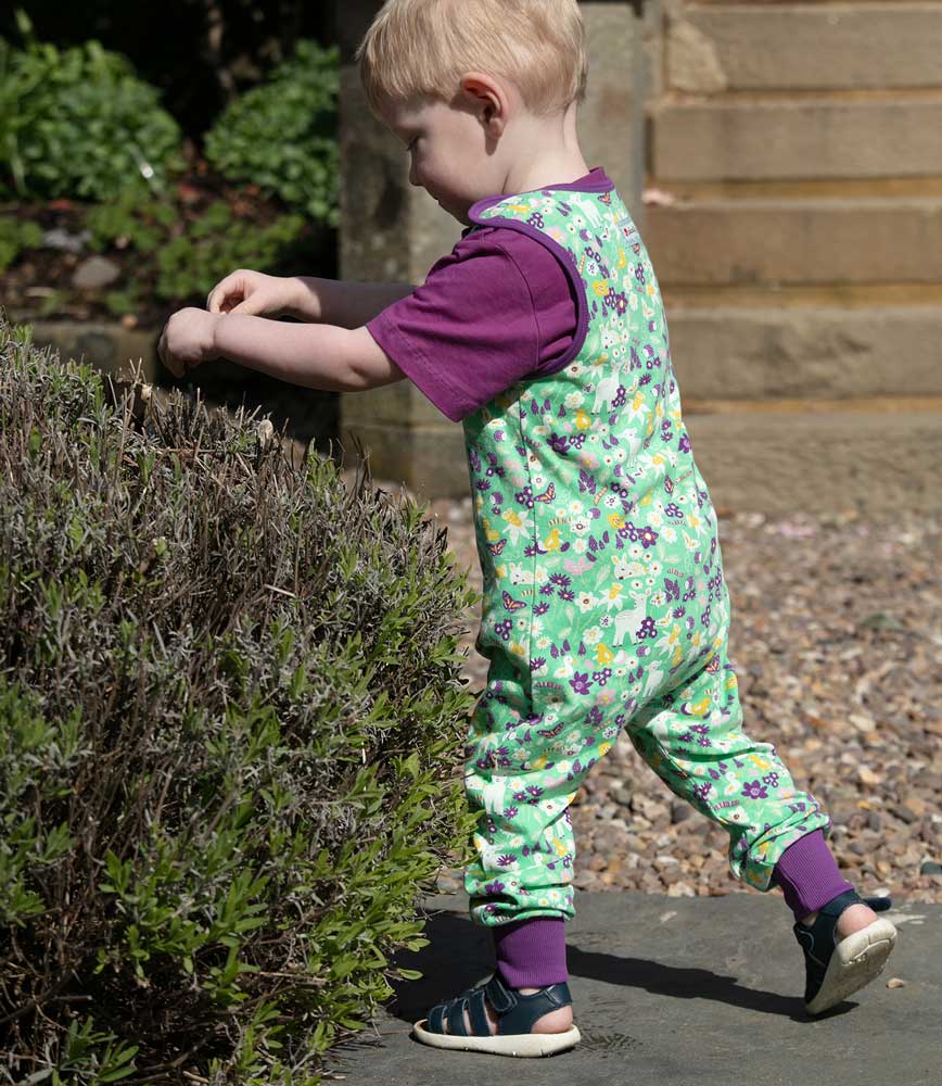 The Piccalilly Spring Meadow Dungarees are beautifully soft light green organic cotton dungarees for babies and toddlers with a yellow and purple pattern incorporating all the wonderful things you might see in a spring meadow, a matching rich purple trim and comfy stretchy cuffs.