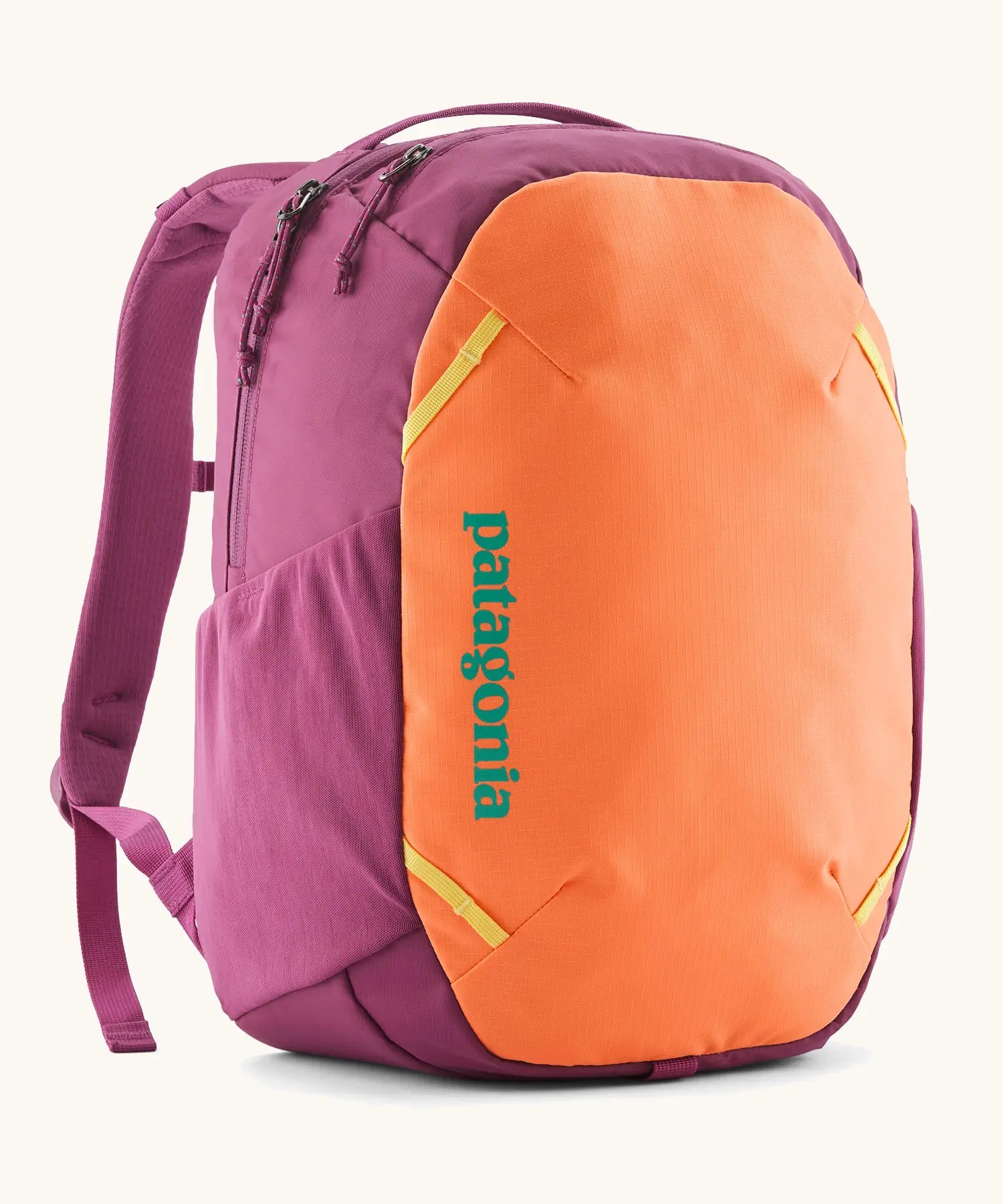 The Patagonia Atom DayPack is a backpack made from 100% recycled materials, designed to balance work-ready organisation with trail-friendly features. Built with a shorter 15-inch torso length, it is ideal for a shorter torso or smaller frame, or for anyone who prefers a more compact pack. Finished in Faded Magenta, it features a magenta pink main body with an orange front panel and green Patagonia logo branding.