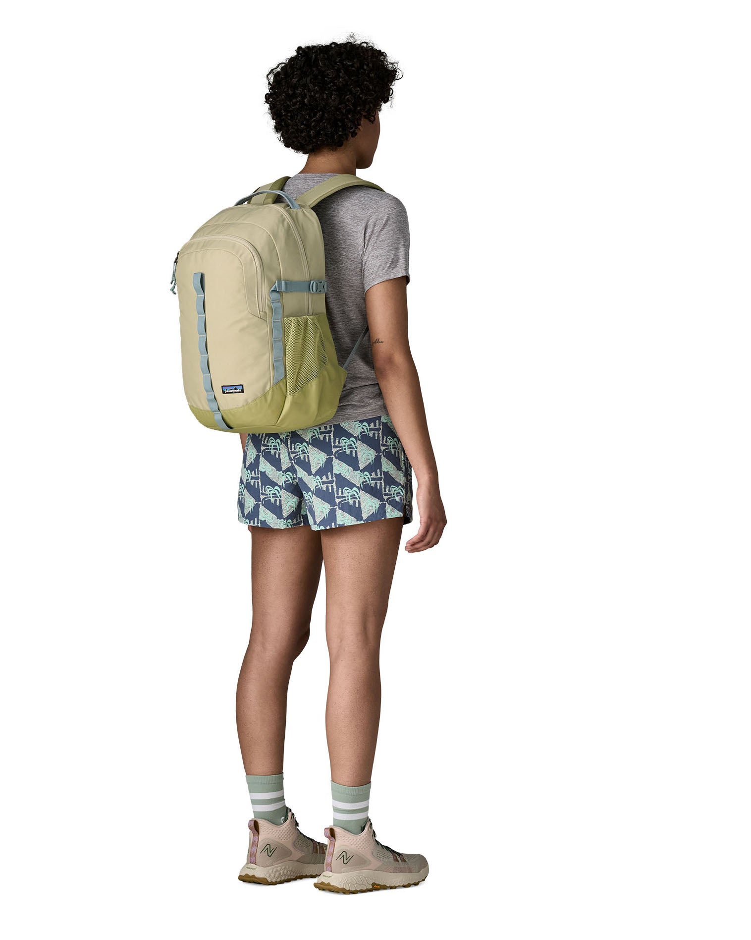 Person wearing the Patagonia 26L refugio backpack in stone with grey straps and top handle.