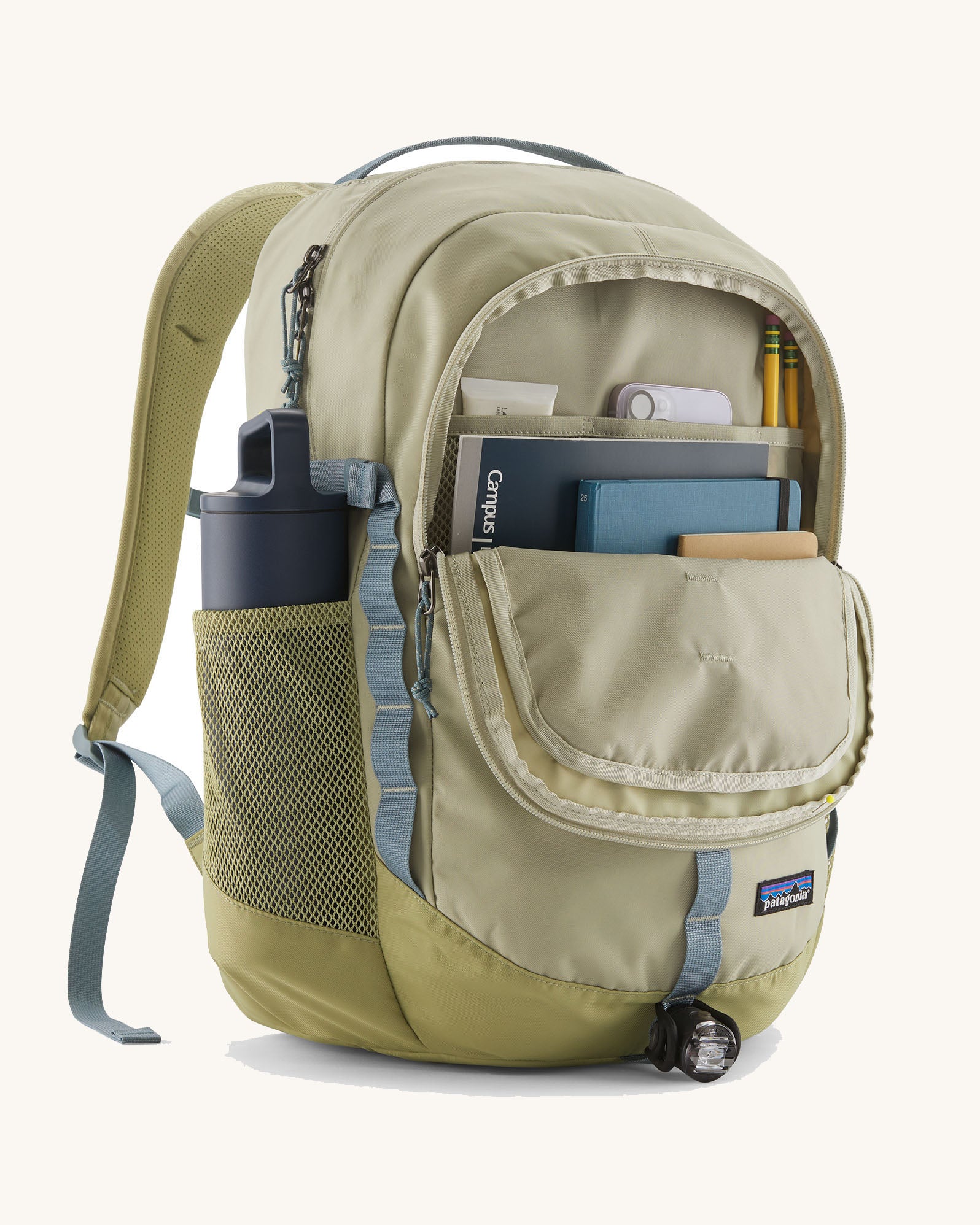 Patagonia refugio backpack in stone with open front compartment with stationery placed inside and a bottle in the side holder.
