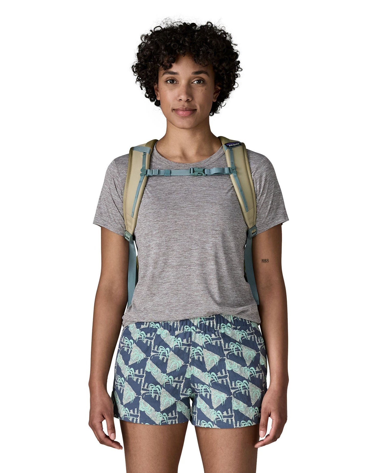 Person wearing the Patagonia 26L refugio backpack in stone with grey chest strap and quick release buckle.