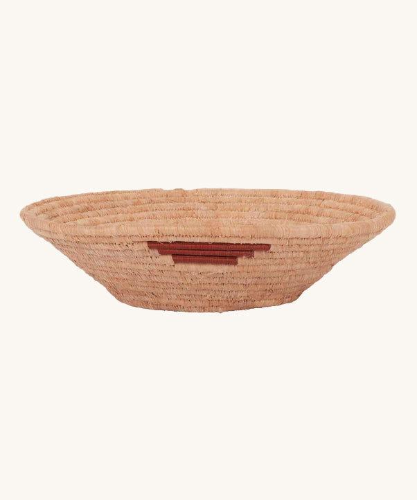 Handcrafted by Congolese refugee weavers, this beautiful natural woven fair trade fruit basket is made from natural grasses with woven copper detailing. A lovely focal point to your dining room table holding a selection of fruit or a trinket dish for the shelf.