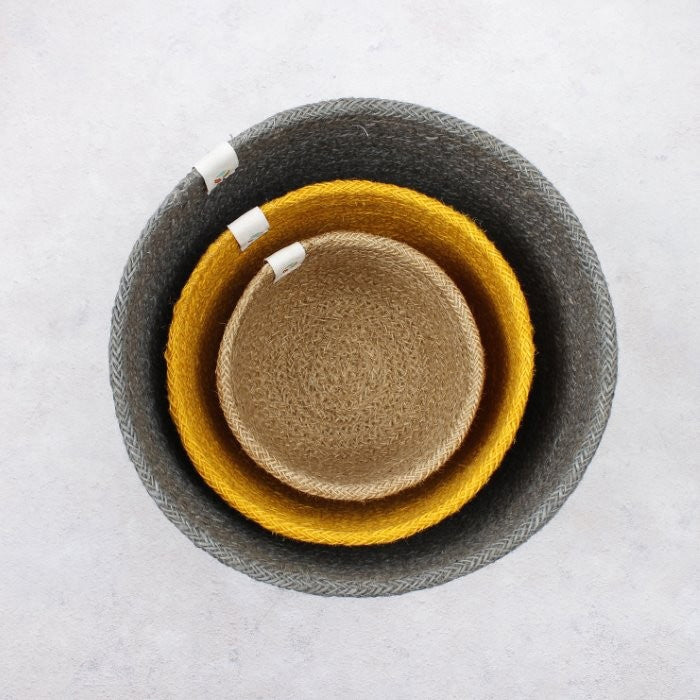 The colours in the ReSpiin beach collection are inspired by the coast - the largest basket being a dark pebble grey, the middle basket a warm sandy yellow, and the smallest basket a natural un-dyed fibre, showing off the natural weave. This set of 3 tall nesting Jute baskets will look great in your playroom or around the home. An ideal size for holding toys such as building blocks, play food and dolls.