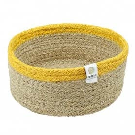 This small shallow natural and yellow basket is just the right size for small toys and craft materials such as marbles, jigsaw pieces, a few wooden animals, little dolls or crayons. This shallow basket is made with natural woven jute and a yellow trim, coloured with azo-free dye.
