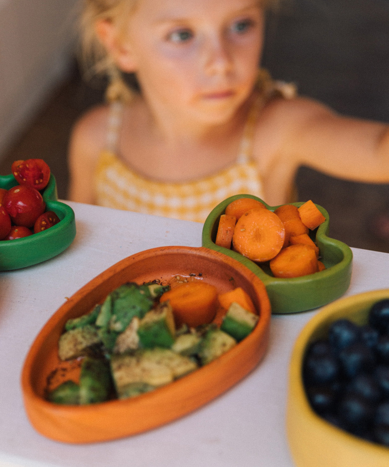 A child standing over the Oli & Carol Cathy the carrot wooden plate and spoon set with food. Set available at Babipur.