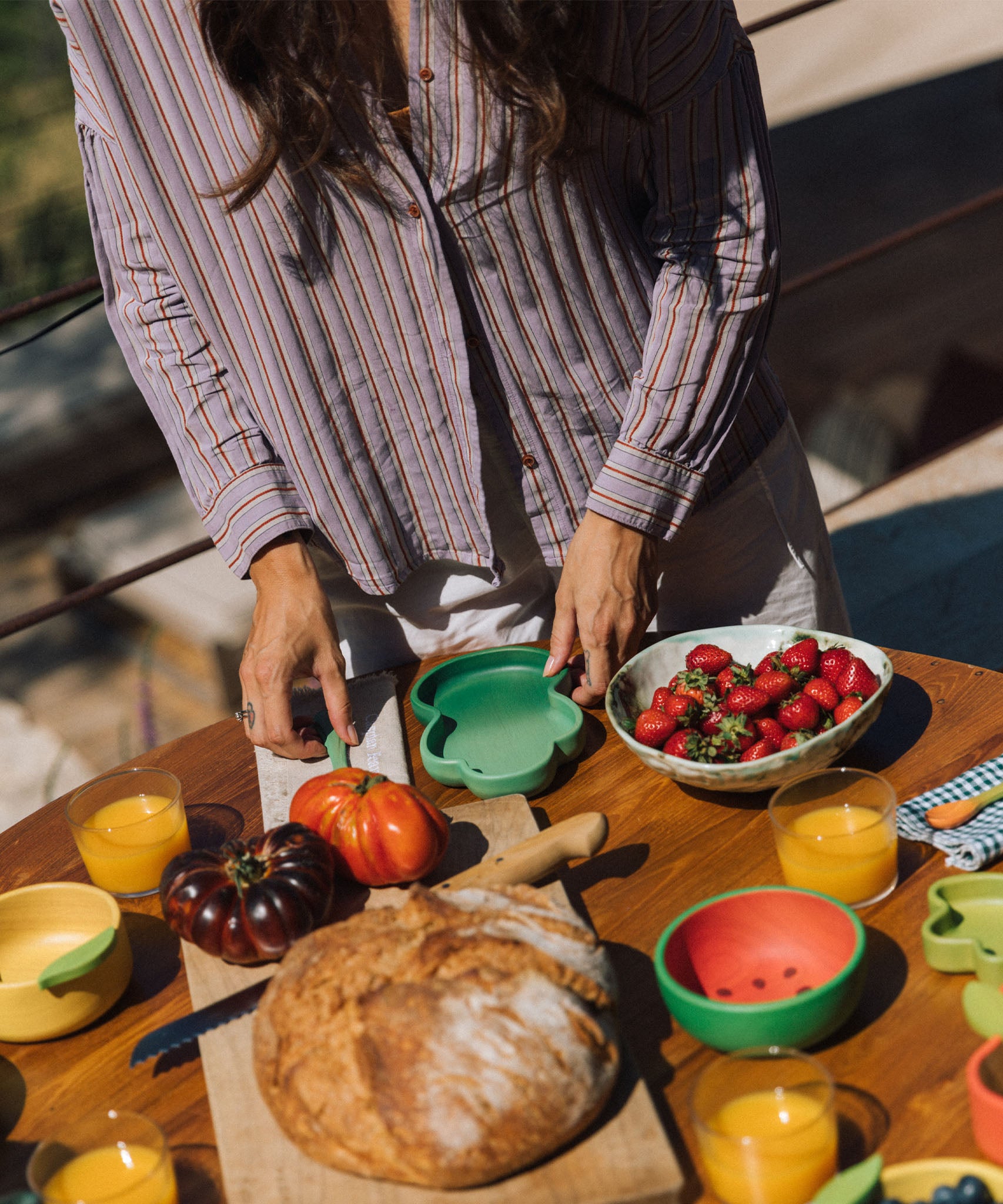 An adult serving food on the Oli & Carol wooden kale plate available at Babipur.