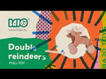 A side on view of the Bajo Pull Along Jumping Reindeer, showing the natural wood and white antlers of the reindeer. The image also shows how the two reindeer's are attached together by two wooden wheels. The image is on a cream background