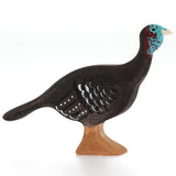 The Bumbu Turkey Hen is a beautiful eco-friendly wooden female turkey toy, hand carved and painted with a black body with white wing feather details, a striking turquoise and red head, and yellow feet. She would make a wonderful display piece for Christmas or Thanksgiving, and a treasured member of a Bumbu farm animal collection.