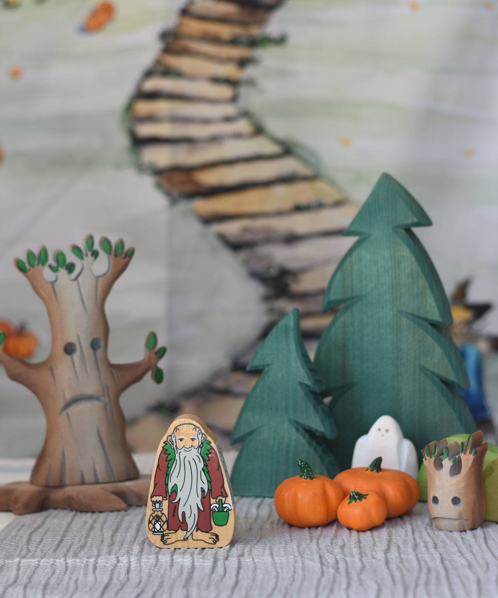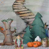 A selection of wooden toys from various brands set up in a small world play scene set up with the Lanka Kade Hermit figure at the front.